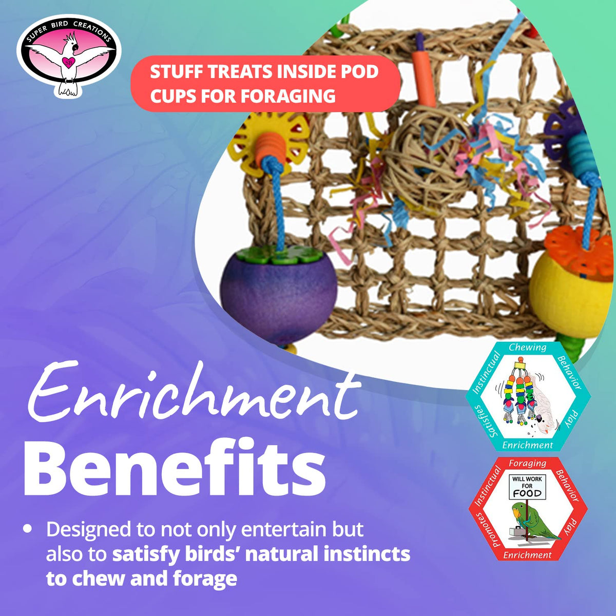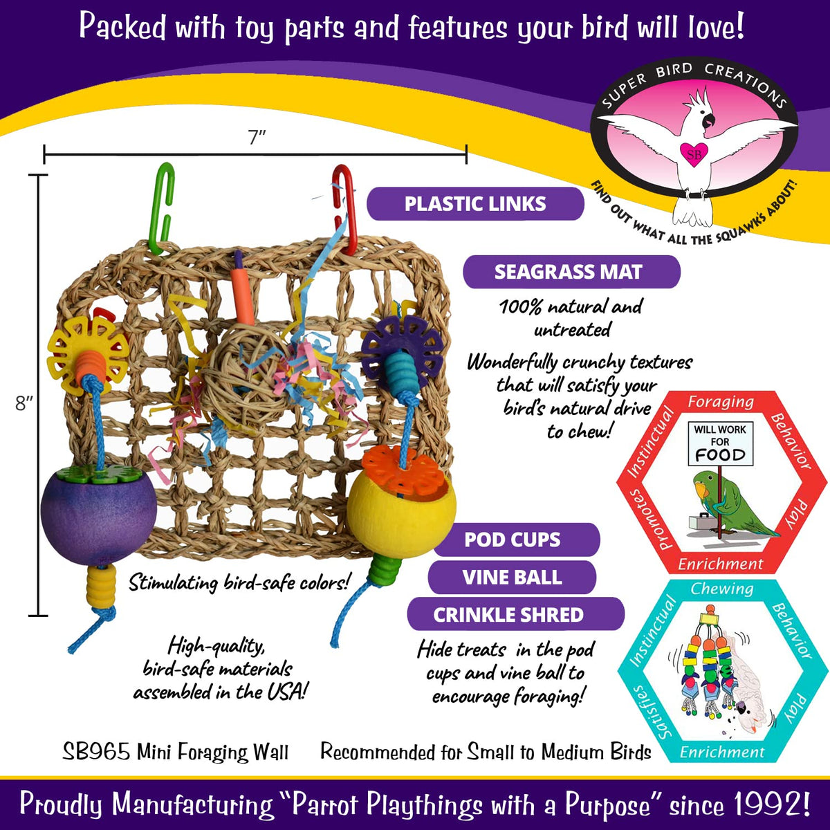 The Mini Foraging Wall Has Two Small Pod Cups And A Vine Ball Stuffed With Crinkle Shred For Your Bird'S Foraging Pleasure.. Relieves Boredom - Properly Designed Bird Toys Are More Than Just Toys . Super Bird Creations Parrot Toys Are Playthings With A Purpose That Help To Ward Off Boredom, Depression, Aggression And Destructive Behaviors In Parrots By Stimulating Physical Activity, Curiosity And Mental Engagement.