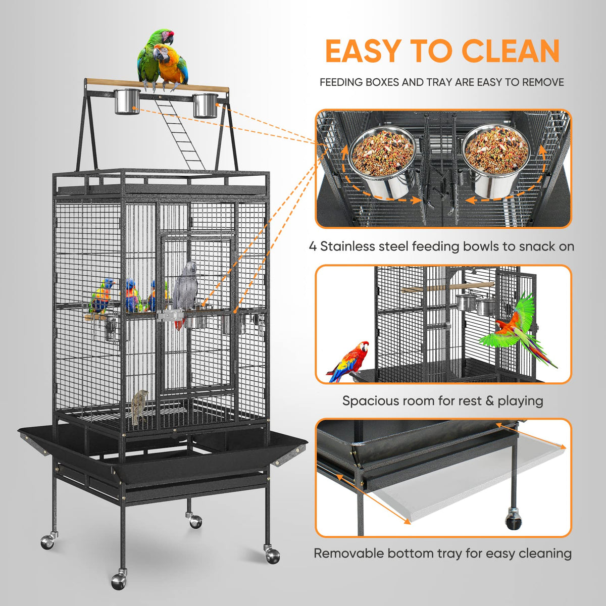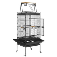Spacious room for your lovely pet! SUPER DEAL Eco-friendly bird case is the perfect shelter for your birds. Note: Please contact seller to get help if you have any product damage or quality issue. We can send free replacement part to solve it. Product Details: Removable feeder cups: Yes Bird Cage Type: Floor Cage Stand Included: Yes Tray Included: Yes Cage Top Design: A layered structure Perch Included: Yes Rolling Casters Included: Yes PACKAGE INCLUDES: (1) Cage Main Frame (1) Ladder (2) Metal Trays (2) Wooden Perches (4) 360Swivel casters (5) Stainless Steel Bowls Specifications: Material: iron Color: Black Dimensions:176 x 81.5 x 77.5cm / 69.2 x 32 x 30.5 Cage Door Size:54.5(H)x 30(W)cm / 21.4 x 11.8 Cage Interior: 22x24x31.6 Bar Spacing: 1.6cm/0.6 Five Cup Diameters:10.2cm/4 Base Tray Size: 22.8 x 21.4 x 1.3 Gap of two steel net: 0.6 inch Net Weight: 47 LBS