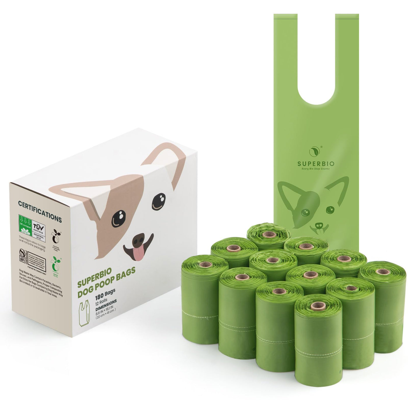 SUPERBIO Extra Thick Dog Poop Bags, 180 Count, Green, Compostable, Strong & Durable - 12 Rolls of Eco-Friendly Waste Bags