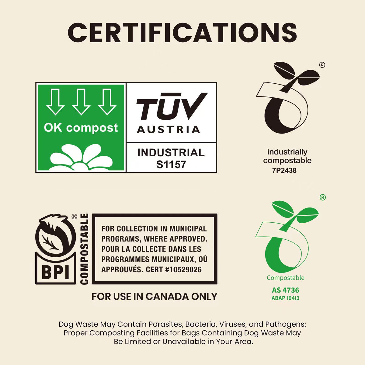 Q: What makes SUPERBIO dog poop bags environmentally friendly?A: SUPERBIO dog poop bags are made from compostable plant-based bioplastic, which helps reduce plastic waste in landfills. They are certified by BPI, OK compost INDUSTRIAL, and SEEDLING, ensuring they meet the standards for commercial compostability.