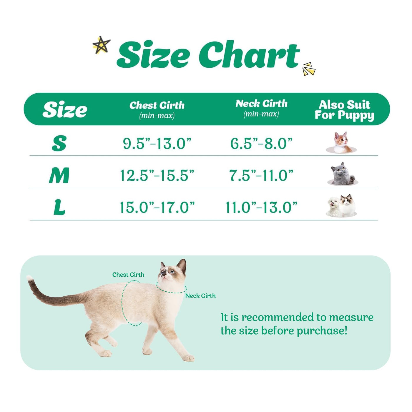 it Average Adult cats Size Small fits chest girth 11-13 inch Neck girth 8-9 inch please MEASURE your dog or cat carefully and refer to the size guide before purchase there may have some difference in the different breedsPackage includes harness and leash WARM TIPS: if its the first time for your cats to wear this kind of harness we recommend that you can guide them to get used to wear it indoor firstly then taking them go outside Super Soft & comfortable This cat harness or small dog harness is made of lightweight soft breathable air-mesh fabric with soft edge and resilient cushioning which can effectively prevent injuries giving extra comfort and protection this all weather pet vest wont be too bulky to restrain your pets movement or overheat your lovely pet when hot and reinforced stitching allows you to walk your pet with confidence Safer & Better control Our cat harness with reflective stripe can reflect ambient light in extreme low-light conditions ensuring maximum visibility when night running This outdoor kitten harness features a sturdy D-ring on the back to attach to a leash Its vest-style design can evenly distribute leash pressure across the chest and shoulders to prevent choking or neck strain which offers much more comfort and security than a basic halter or H-style harness o Lost Again This cat harness has 2 side buckles for secure closure The adjustable straps around the harness allow you to quickly customize the vest to your cats tiny frame so that heshe wont slip out easily or even get lost during outdoor adventures Plus it gives room to grow for your curious and fast-growing pet (Please use snacks to guide your cat to get accustomed to this harness more details in the descripion as below) 100% Satisfaction & Quality Assurance We foucs our mind on pet supplies our mission is to let all pet owners enjoy every second with their pets If you have any question please feel free to contact us and we will help you within 24 hours *Attention: Most cat is a talented escape artist they may try hard to slip out of the harness especially they never use it before please be patient and guide them to get used to wearing this harness