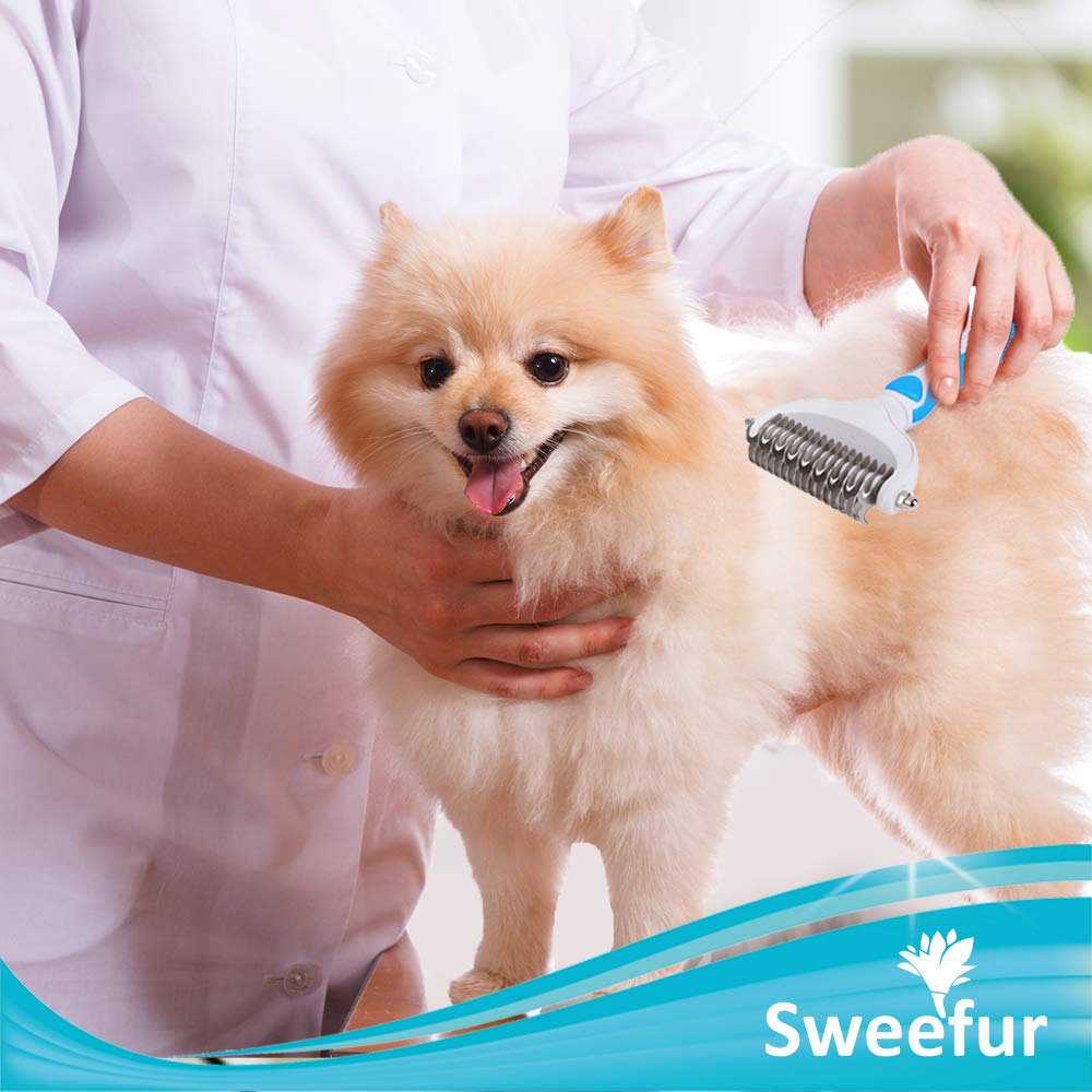 Sweefur Pet Grooming Comb- 2 Sided Undercoat Rake For Dogs & Cats- Professional Teeth Pet Brush For Shedding And Remove Mats & Tangles- Grooming Rake Tool For All Pet Sizes- Blue