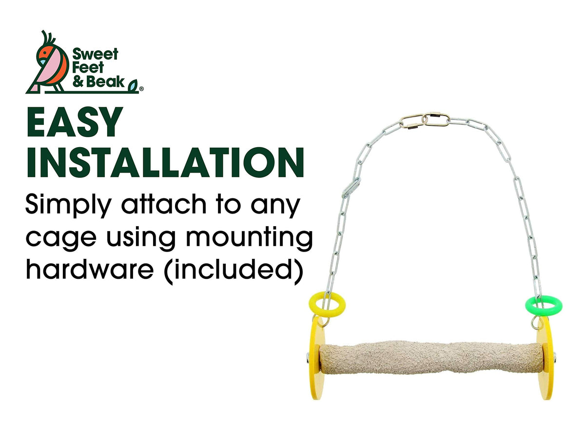 Q: Is the material of the bird swing safe for my pet?A: Yes, the Sweet Feet and Beak Roll Bird Swing is made from non-toxic materials, including a concrete blend for the perch and a zinc-free hanging chain. All materials used are safe for birds, ensuring a healthy play environment.