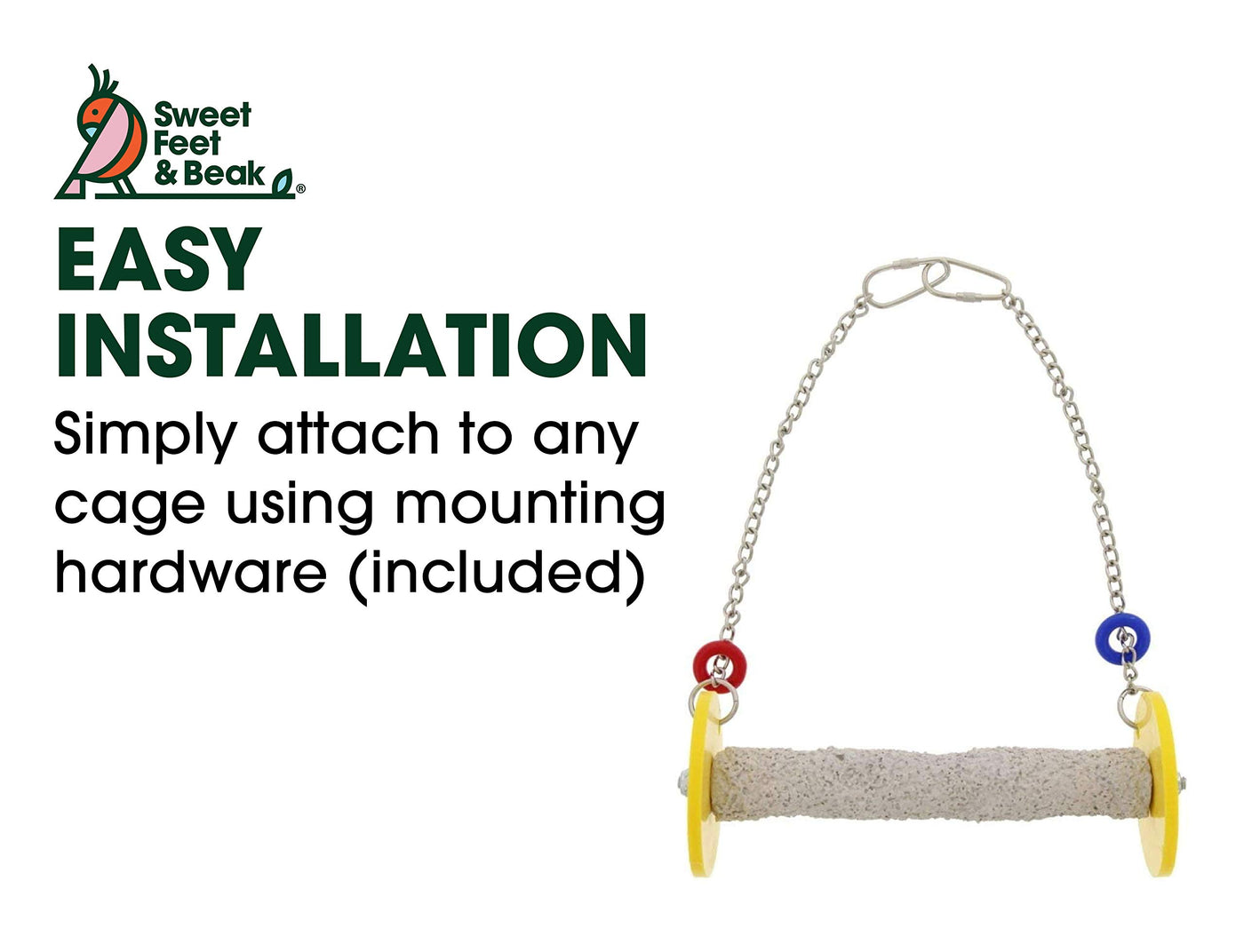 Q: How do I install the Sweet Feet and Beak Roll Bird Swing in my birdcage?A: Installation is easy with the included c-rings. Simply attach the swing to your existing birdcage using the strong, bite-proof chain with welded links for added security.