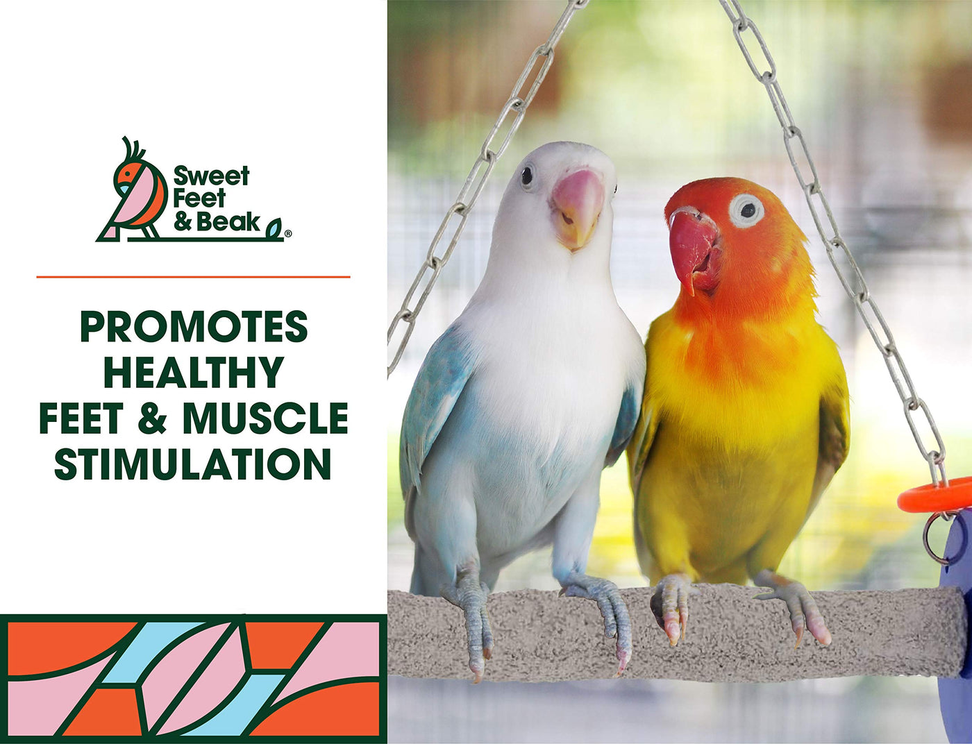 Q: Is the material used in the bird swing safe for my pet?A: Yes, the Sweet Feet and Beak Roll Bird Swing is made from non-toxic materials, including a concrete blend perch and a zinc-free hanging chain, ensuring the safety and health of your feathered friend.