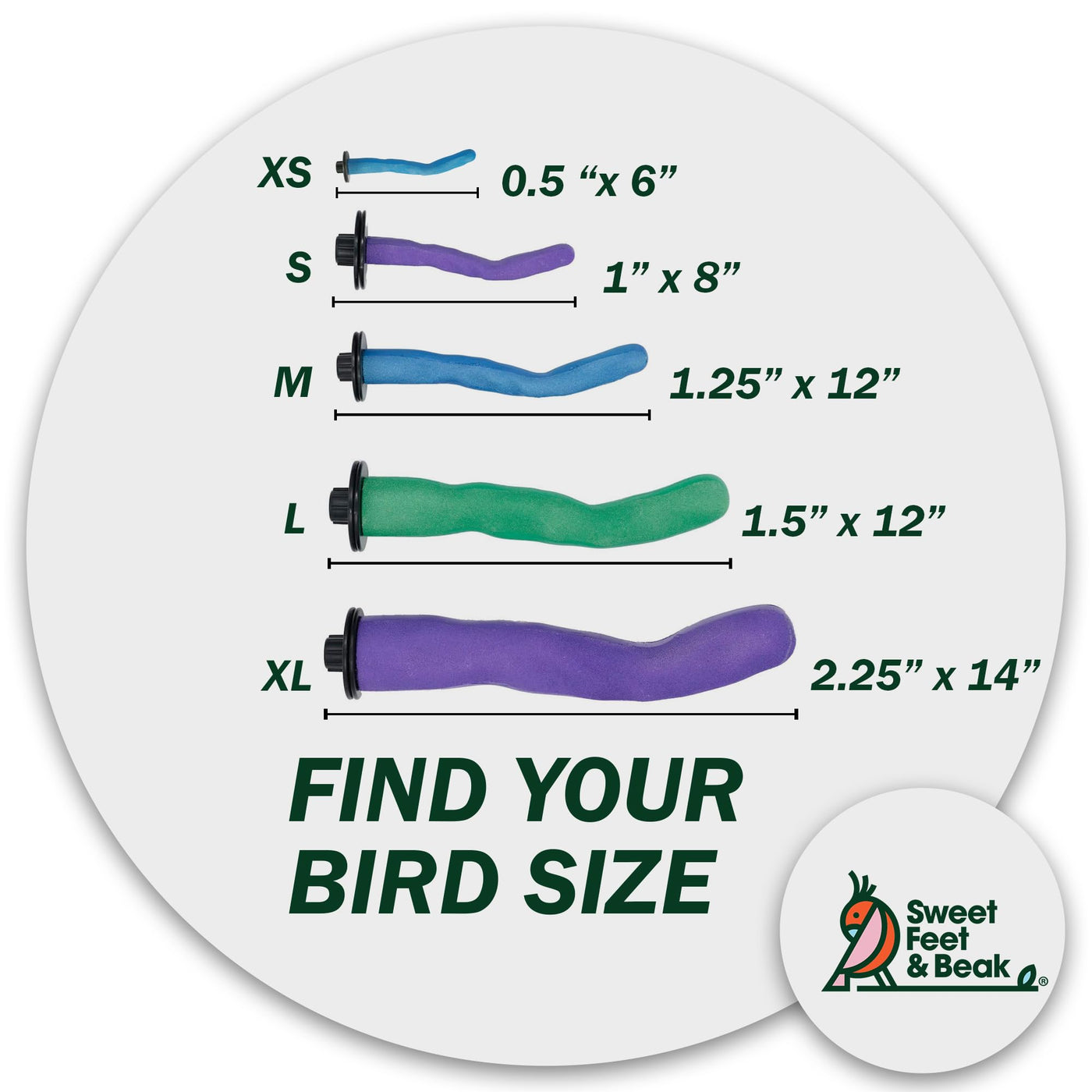 Q: What sizes are available for the Sweet Feet and Beak Safety Pumice Perch?A: The Sweet Feet and Beak Safety Pumice Perch is available in five sizes: XS, Small, Medium, Large, and XL to accommodate a variety of bird species.
