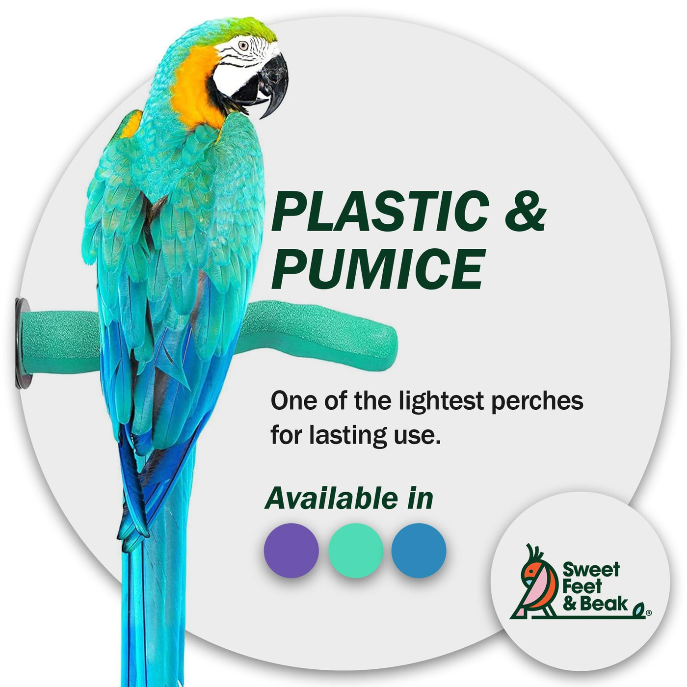 The SF&B Safety Pumice Perch is one of the lightest yet strongest perches for birds available, crafted with high-quality plastic and pumice that birds of all kinds and sizes will love. This unique bird beak grinding stone perch features a smooth surface for your bird’s comfort while the rough sides provide grip and keep nails naturally trimmed and healthy. Designed with your pet's safety in mind, these bird perches for parrots include a safety cap for mounting—no dangerous metal hardware sticking out of the cage. Plus, we use only bird-safe glues and dyes to ensure the well-being of your feathered friend. Our versatile bird supplies for parrots come in five sizes (XS, Small, Medium, Large, XL) and three vibrant colors (Blue, Green, and Purple), perfect for any cage setup. It’s super easy to install and designed specifically for horizontal bar mounting. The lightweight plastic base of the beak grinder for birds ensures durability without the weight of cement, making it simple to attach and clean. Our Safety Pumice Perch provides your birds with the essential care and grooming accessories they require daily. About Us: For over two decades, Sweet Feet & Beak has been a trusted name in bird care, producing perches, toys, ladders, swings, and more. Our handcrafted bird products are designed for your pet to feel right at home.