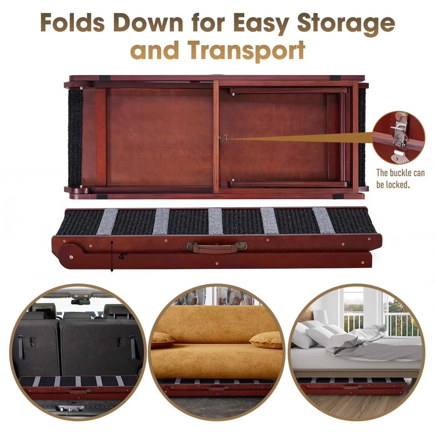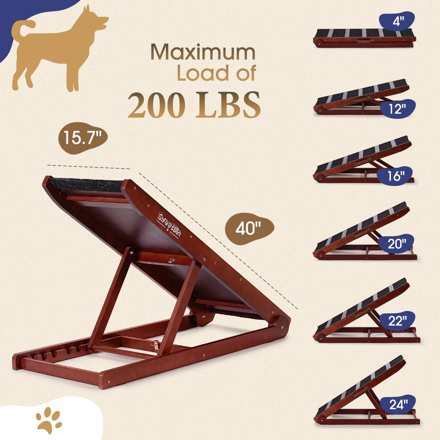 Sweetbin 5 Levels Height Adjustable Portable Pet Ramp Is An Attractive Way To Help Pets Reach Their Favorite Places. For The Elderly Or Arthritic Pet, Sweetbin Pet Ramps With Gentle Climbing Angles Are An Ideal Solution ? Perfect For Helping Pet Reach The Car, Bed, Couch Or Other Favorite Places ? Self-Supporting, It Do Not Need To Be Attached To The Vehicle Or Furniture ? Ideal For Older Or Arthritic Pets ? Folds Down For Easy Storage ? No Assembly Required Features: ? Product Name: Pet Ramp ? Four-Layer Adjustable Height: 12, 16, 20 And 24 Inches ? Folding Size: 40.15'' L X 16'' W X 4.1'' H ? Weight Capacity: 200Lb ? Material: Natural Wood, Fabric Our Guarantee: We Are Totally Obsessive About Quality And Customer Service - If You Have Any Questions Please Get In Touch And We Will Do Everything We Can To Solve Them. Wish You A Pleasant Shopping Experience In Our Store!