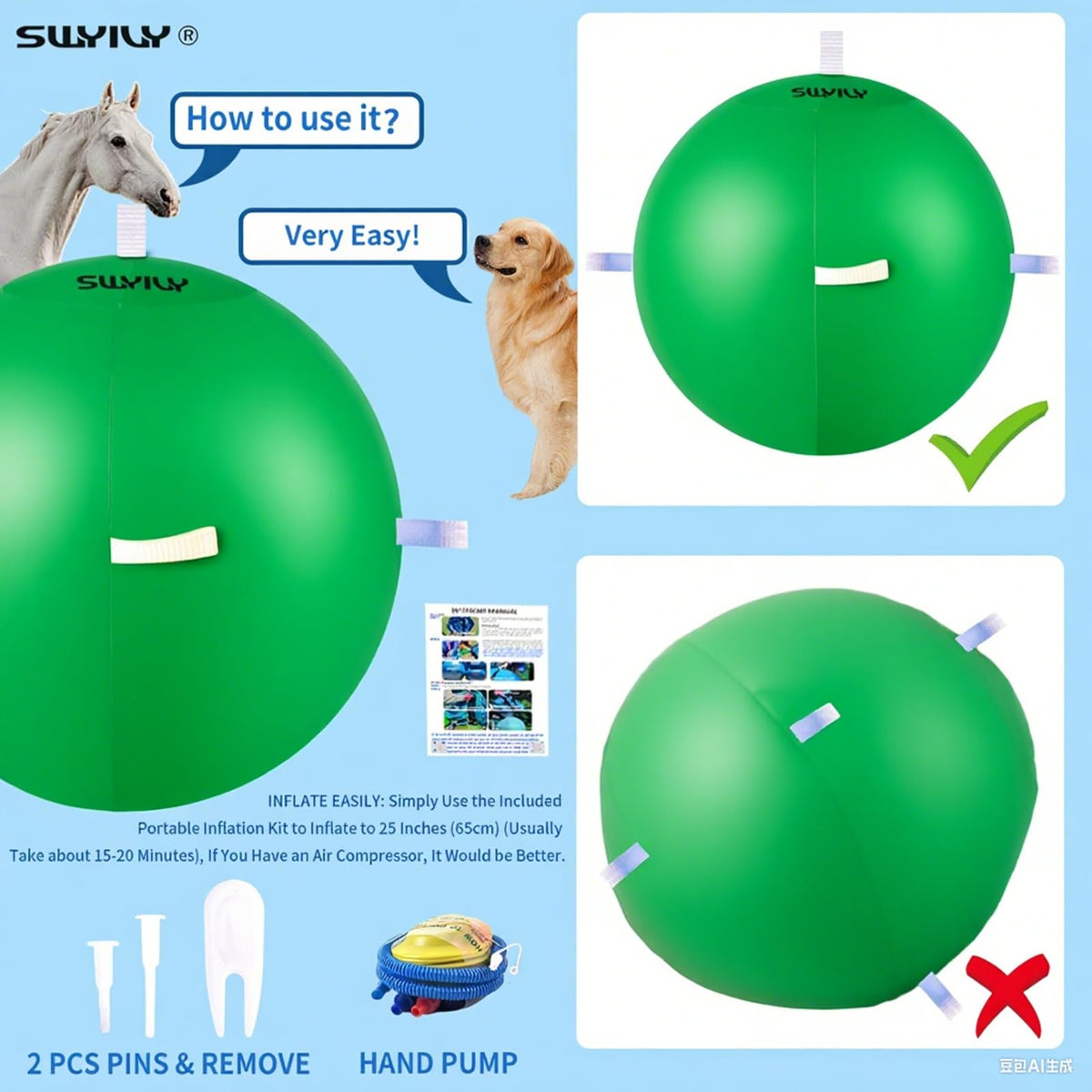 Product Highlights Dual-Cover Design with Interactive Straps Switch between vibrant light blue and green covers to spark pets curiosity during playtime. The textured woven straps allow dogs to grip and carry the ball effortlessly, ideal for tugging games or interactive sessions with horses. Layer both covers to create dynamic visual stimulation, keeping pets engaged longer1. High-Visibility Color Scheme Designed with pet-friendly light blue and green hues, this ball ensures visibility in outdoor environments like grassy fields or sandy trails. The ribbed surface enhances grip for both pets and handlers during fetch or agility training1. Dynamic Rolling Motion Mimics the unpredictable bounce of a tennis ball to trigger pets natural chasing instincts, building confidence during solo play or group activities. Perfect for backyard adventures, barn training, or bonding sessions with active dogs and horses1. Quick Inflation & Portable Storage Includes a compact inflation kit compatible with bike pumps or air compressors (assembly time: 25-35 minutes). Deflates to 1/3 of its size for easy storage in travel bags, tack rooms, or car trunks1. Family-Safe & Easy Maintenance Machine-washable covers resist dirt and saliva buildup, while the seamless construction minimizes snagging risks. Key Specifications Size: 25-inch diameter (63.5 cm) for large breeds (30kg+) and equine use. Materials: Lightweight PVC core + polyester fabric covers. Included: 1 inflatable ball, 2 interchangeable covers (blue/green), inflation pump1. Ideal For Dogs that enjoy carrying toys (e.g., Retrievers, Shepherds). Horses requiring mental stimulation in stalls or pastures. Outdoor enthusiasts seeking durable play solutions.