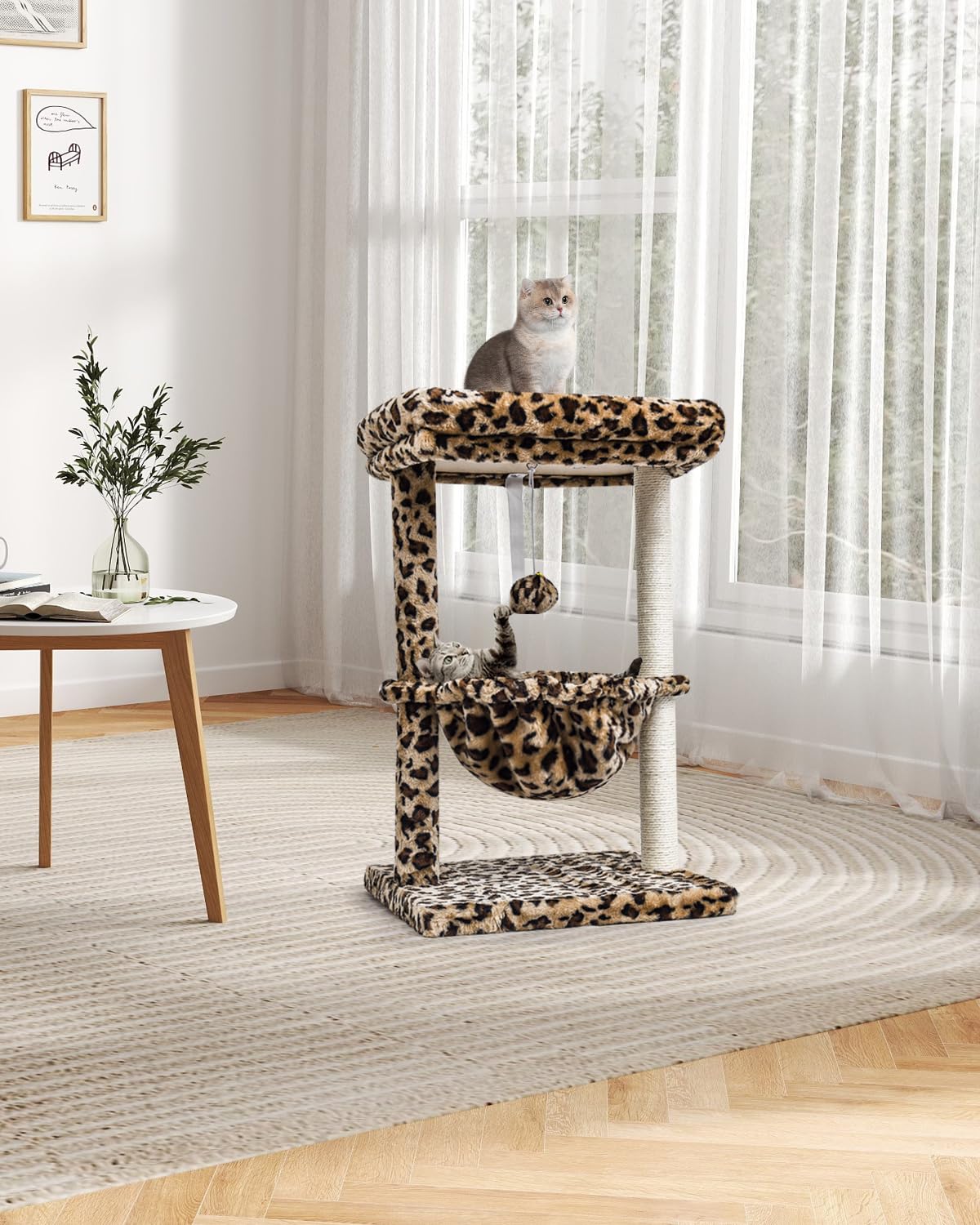SYANDLVY Small Cat Tree for Indoor Cats, Unique Leopard Print Cat Tree Tower for Kitties, Condo Furniture with Hammock & Sisal S