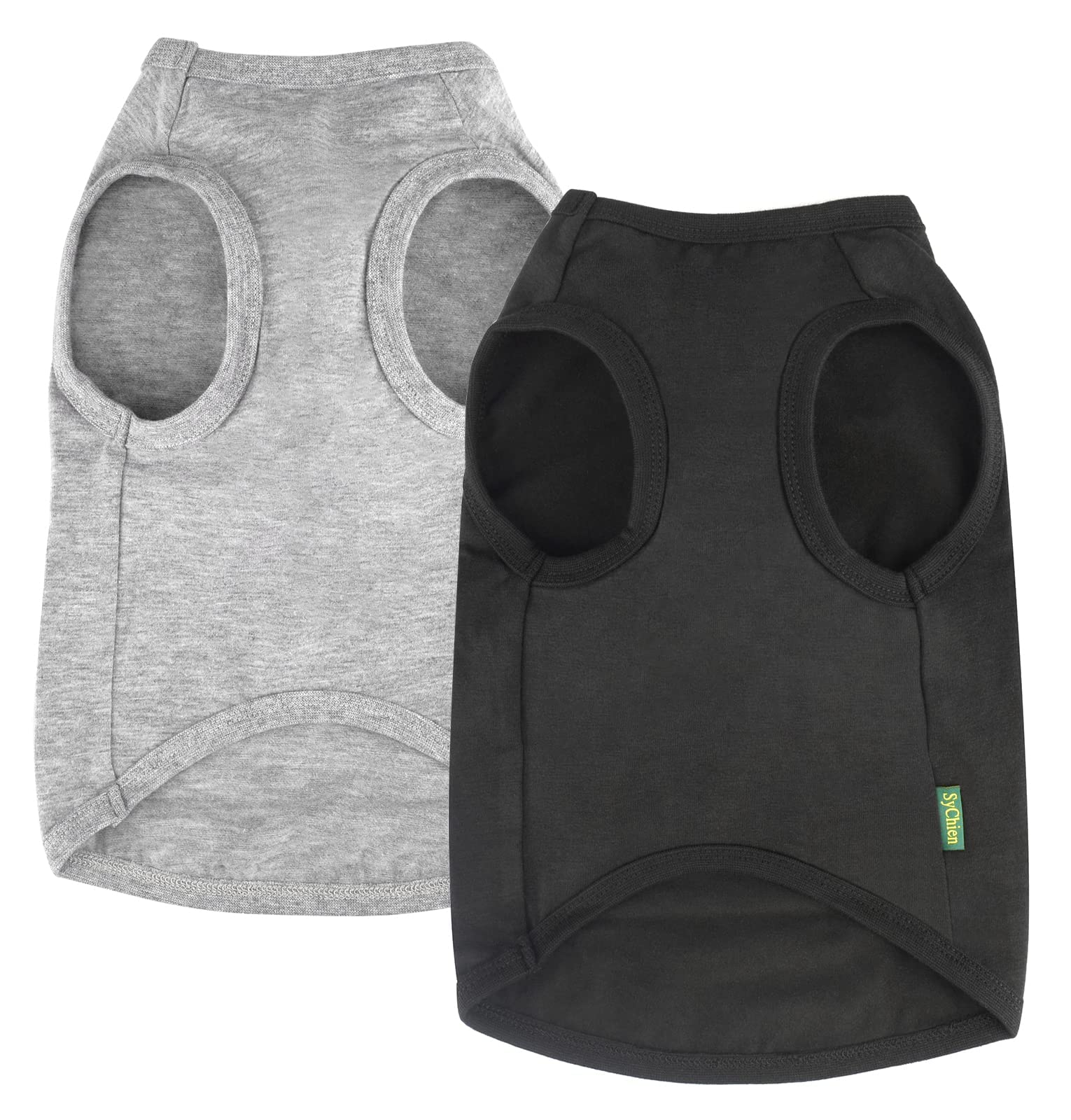 Dog Sleeveless Blank Shirt Fits Small,Medium,Large Cats And Dogs;Soft Comfy Breathable Cotton+Polyester Fabric;Rib-Knit Neck/Cuffs Are 95% Cotton,5% Spandex,Ensure This Clothes More Stable And Keep In Shape After Wash,More Comfortable Without Feeling Too Snug;The Classical Fashion Striped Elements For Every Occasions;Perfect Gift For Holiday Like Christmas,Hannukah, Valentines'S Day,Mother'S Day,Father'S Day,And Special Occasions Like A Birthday,Party,Photos,Anniversary Or Everyday Wear; How To Find A Right Size Dog Shirt A)Choose The Size According To The Latest Measurement; B)Priority Follow The Chest Size,Then The Back Length; C)If Between Size,Size Up; Our Dogs Costumes For Most Kinds Breed,Such As Yorkie, Toy Poodle, Chihuahua, Maltese Pomeranian, Maltese, Bichon, Shih Tzu, Min Pin, Miniature Dachshund Bichon, Fox Terrier, Jack Russell, Scottie Cocker Spaniel, Schnauzer, Westie, Pug, Boston Terrier Beagle, French Bulldog, Schnauzer Beagle, Corgi, Standard Dachshund, English Bulldog; Package Come With 2-Pack Dog Xl Shirts,Blank Black And Grey Color Clothes,Fits 19.3''Back,26''Chest,Dog Tshirt Recommend For 37Lbs-55Lbs Big Dog ,Such As Bulldog, Corgi, Boxer, Chow Chow, Dachshund. Sychien Dog Clothing Fits The Way Your Four-Legged Friend Live,Keep Your Dogs Warm,Cool,Comfortable In Spring,Summer,Autumn,And Winter-Ready. A Basic Dog Shirts Can Simply Fits All Season,Quick Dry Cooling Shirt Offer A Cooler Summer,Pajamas Can Keep Your Small Medium Large Dogs Warm And Comfortable All Night,Windproof Coat For Cold Winter And Snowy Days. Variety Size And Color Pet Dog Cat Clothes For Choose,Solid Color Like Plain Black,Blank Grey,Red,Blue,Striped Pattern Like Classical Red-Black,White-Black.Hand Selected Fabric,You Can Find Summer Tshirt,Hawaiian Cooling Quick Dry Clothes,Holiday Apparel,Winter Warm Coat,Reflective Jacket For Small To Large Dogs;Two-Legs Shirts Can Fit Your Fur Friends