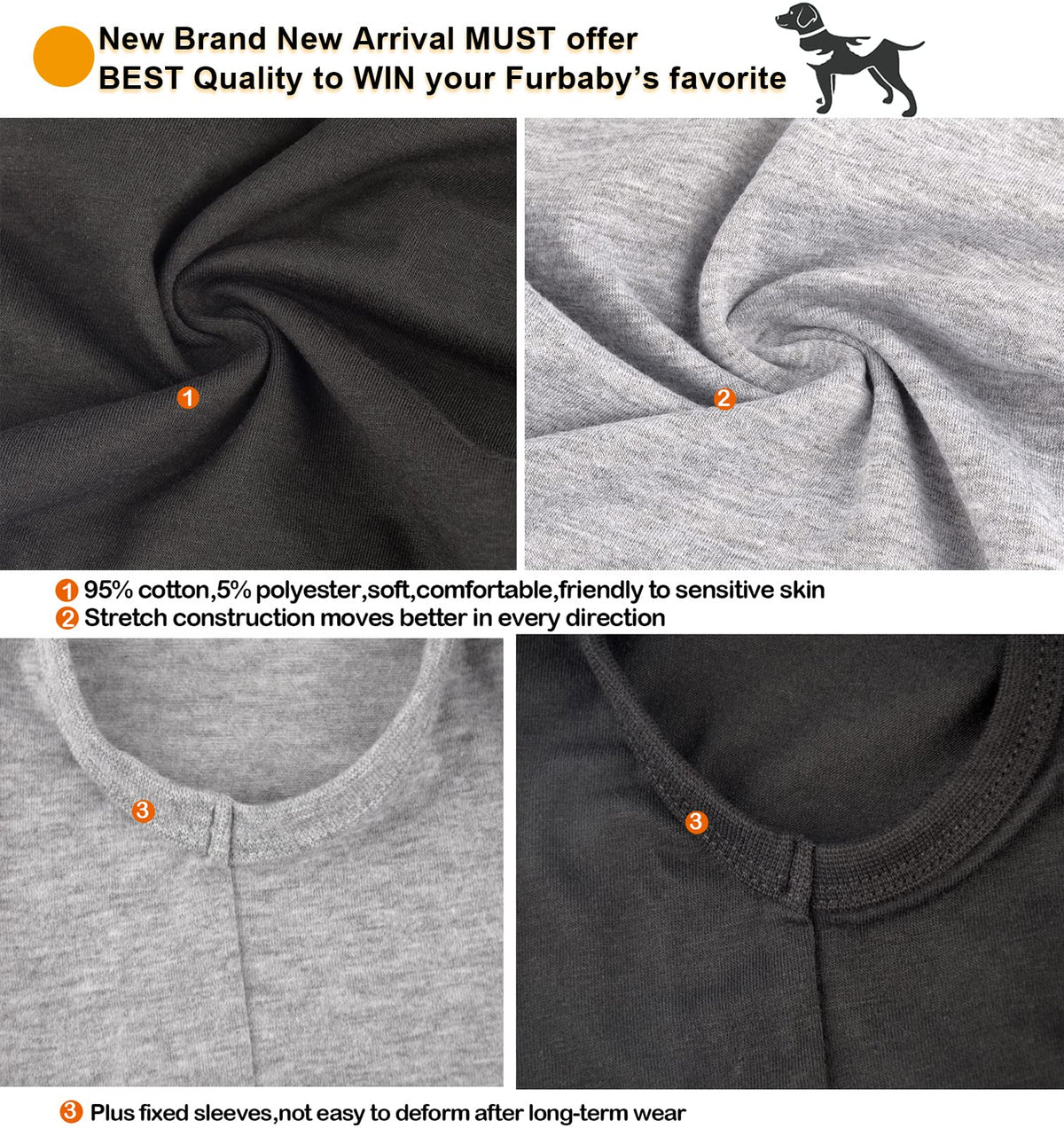 - Q: What materials are used in the construction of these dog shirts? A: These dog shirts are made from a soft and breathable fabric blend, consisting of 95% cotton and 5% polyester, with rib-knit neck and cuffs made of 95% cotton and 5% spandex, ensuring comfort and durability.