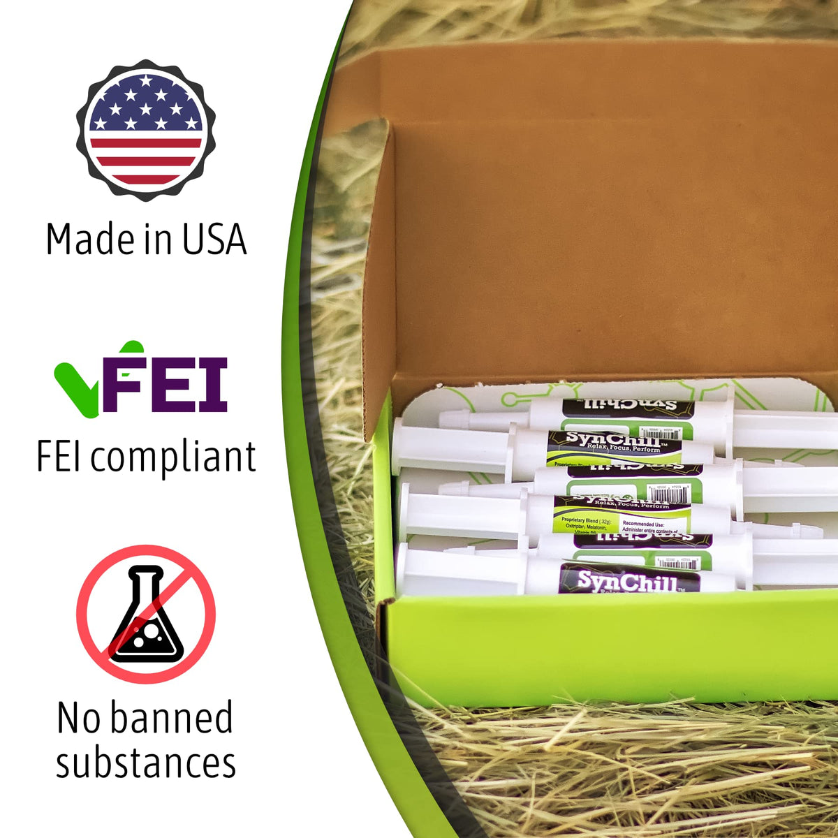 COMMITTED TO EXCELLENCE & NUTRITION. A natural approach to help safely and effectively calm and focus your esteemed horse no matter the task: training, racing, trailering, roping, showing, etc.! Unlike typical tryptophan-based supplements, SynChill is the only one that contains 5-HTP (5-hydroxytryptophan) - a game-changer among equine calming products. 100% NATURAL EQUINE CALMING SUPPLEMENT. SynChill contains a unique blend of the highest quality natural biochemical substances, repetitively proven effective in reducing anxiety and calming in horses, even in extremely challenging environments. Dispensed in handy single-dose syringes, SynChill is a pleasantly sweet-tasting, odor-free, clear gel. HELP YOUR HORSE REACH PEAK PERFORMANCE. SynChill produces a sense of relaxation in your horse when administered in advance of a stressful event BUT also allows horses to both focus and perform confidently and securely; with the complete mental clarity and physical ability that sedatives and tranquilizers simply cannot offer! SAFE, EFFECTIVE, & COMPLIANT. Our equine products do not contain any banned substances on the USEF Drugs & Medication Guidelines or the FEI Prohibited Substances List. 100% USA MADE and UNCONDITIONALLY GUARANTEED! Our formulations took many years to perfect, so we are confident in our money-back guarantee.