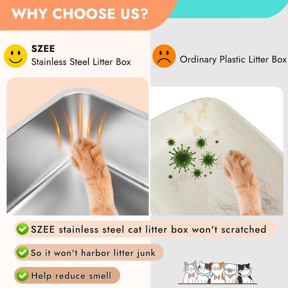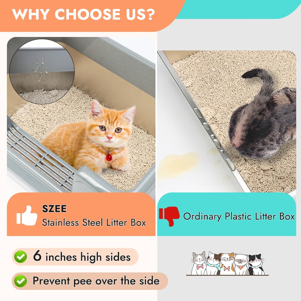 Szee Stainless Steel Litter Box, No Scratches, Easy To Clean And No Absorb Odor, Cat Litter Box With High Sides, Prevent Pee Fro