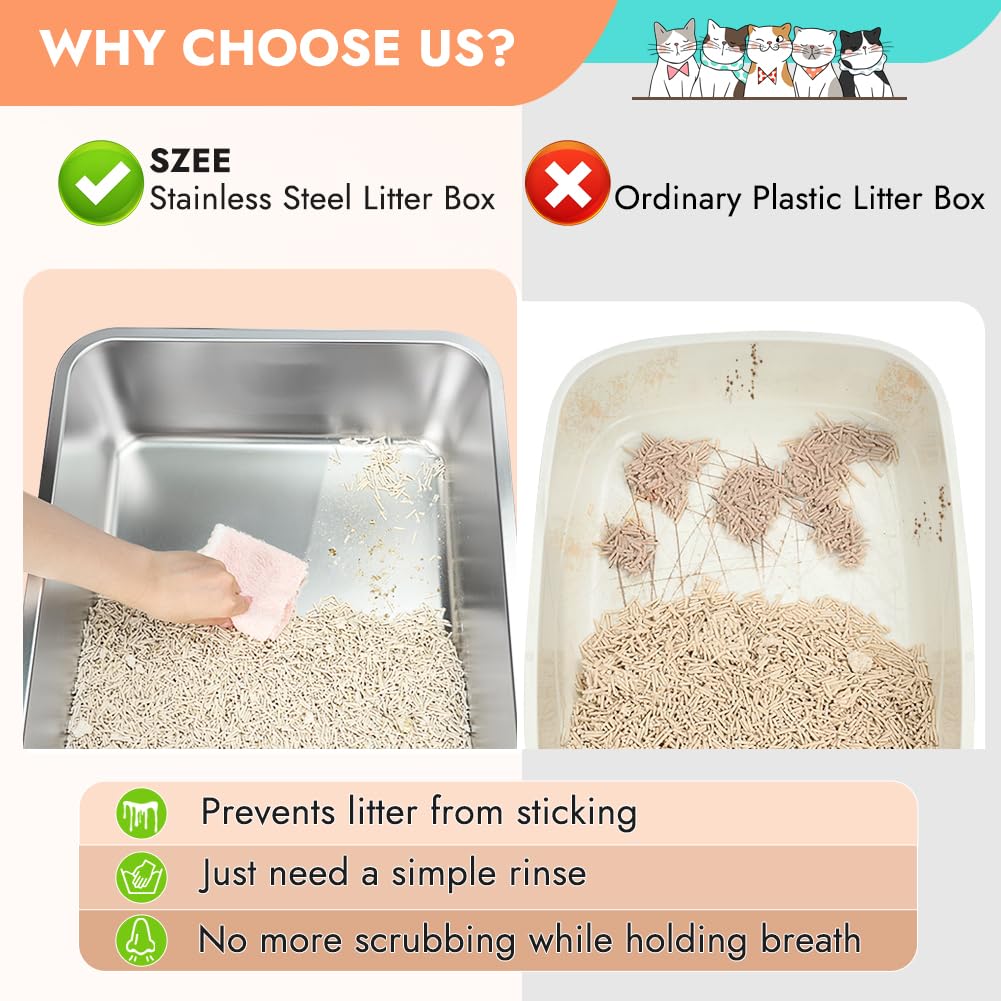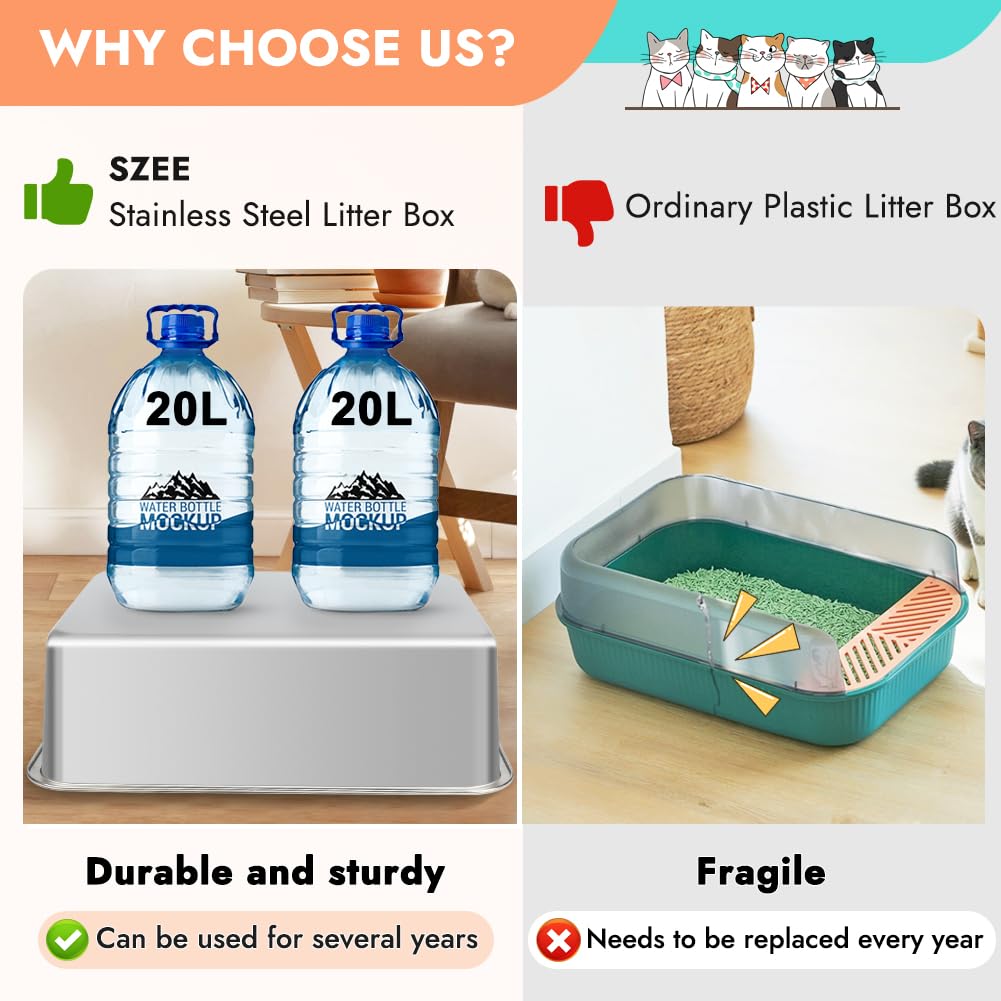 Get Your Cat A High-Quality Litter Box That Makes Life Easier For Both Of You! Thanks To The Stainless Steel Construction, Litter Wont Stick To The Bottom Or Sides, So Cleaning Is A Breeze-Just Rinse It Out. No More Scrubbing While Holding Your Breath! Ever Wonder Where The Awful Smell From Plastic Litter Boxes Comes From? Its Usually Because Scratches On The Plastic Trap Urine And Litter Debris, Making It Tough To Clean And Causing Lingering Odors. Our Stainless Steel Litter Box Is Scratch-Resistant, Eliminating This Odor Problem At The Source. While A Standard Plastic Litter Box Might Seem Cheap, It Typically Needs Replacing Every Year. Our Metal Litter Box, However, Is Built To Last For Years, Making It A Smart, Long-Term Investment. Invest In A Litter Box That Not Only Meets Your Cats Needs But Also Makes Your Life Easier!