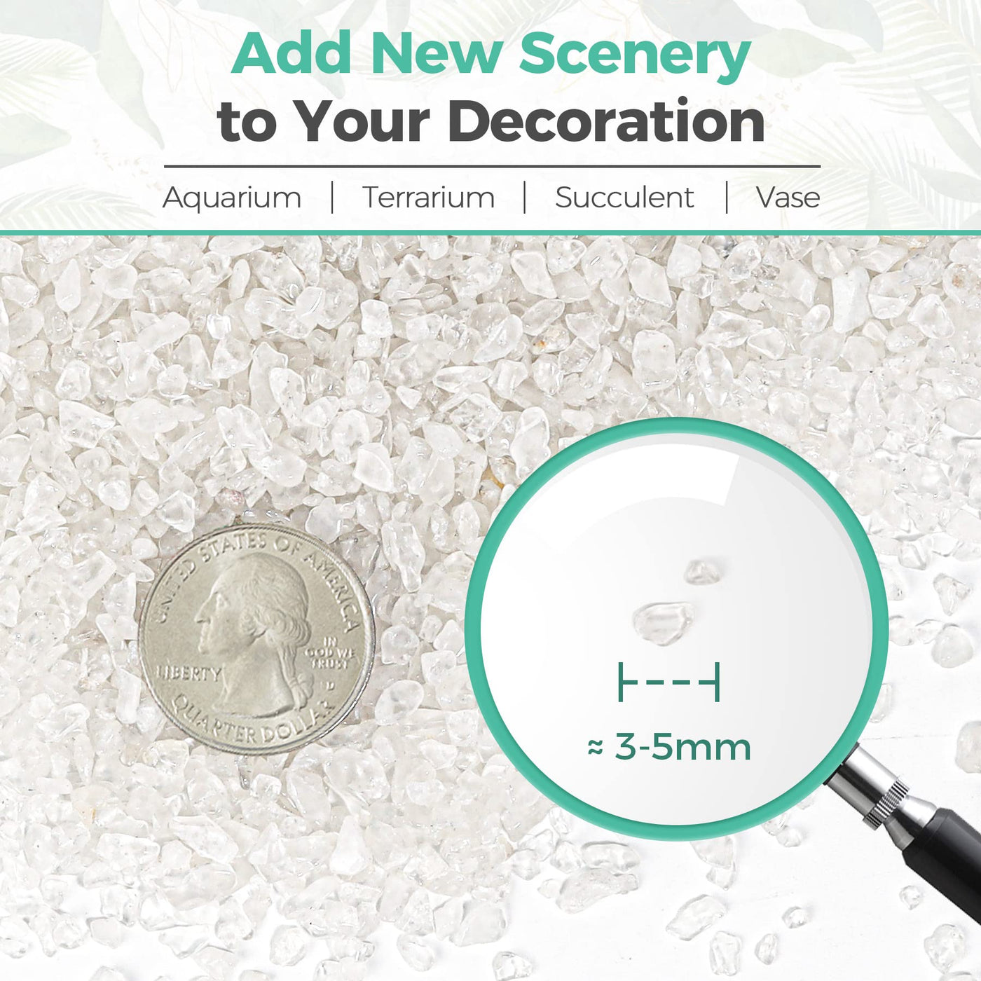 [ T4U Decorative Glass Chips Stones - 2 lb ] [ Package Contents ] Glass Chip Gravel x 2 bag (About 1 lb / 450g). [ Key Features ] - |Natural Premium Material| Made of carefully selected quartzs using fine processing crafts at high temperature, attractive yet sturdy and durable. Non-toxic and safe just like river gravels, natural color resists fading for long-lasting beauty. - |DIY Decor Expert| Mini colorful gravels in irregular shapes. Add vitality to your succulent plant, cactus or bonsai in home, yard, garden or office. Perfectly decorate your fish tank with vivid color and also maintain the water clean. - |Great Plants Defender| Crushed draining crystals can effectively buffer and preserve redundant water, besides, they can prevent the loss of nutrients and soil while watering or raining, which keeps the plants grow healthily in many ways. [ Warm Tips ] - Rinse for 2-3 times for the first use to wash away any dirts. - Keep away from little children and pets to avoid mistaken eating. [ Know More About T4U ] Since 2016, T4U has committed to gardening field for bringing more nature beauty to your living space. Our mission is to enhance the quality of your life by adding more vibrant energy to your home and garden. We cherish every value customer like you, and we provide prompt solution for all product issues or any non-satisfaction. T4U, Think for You