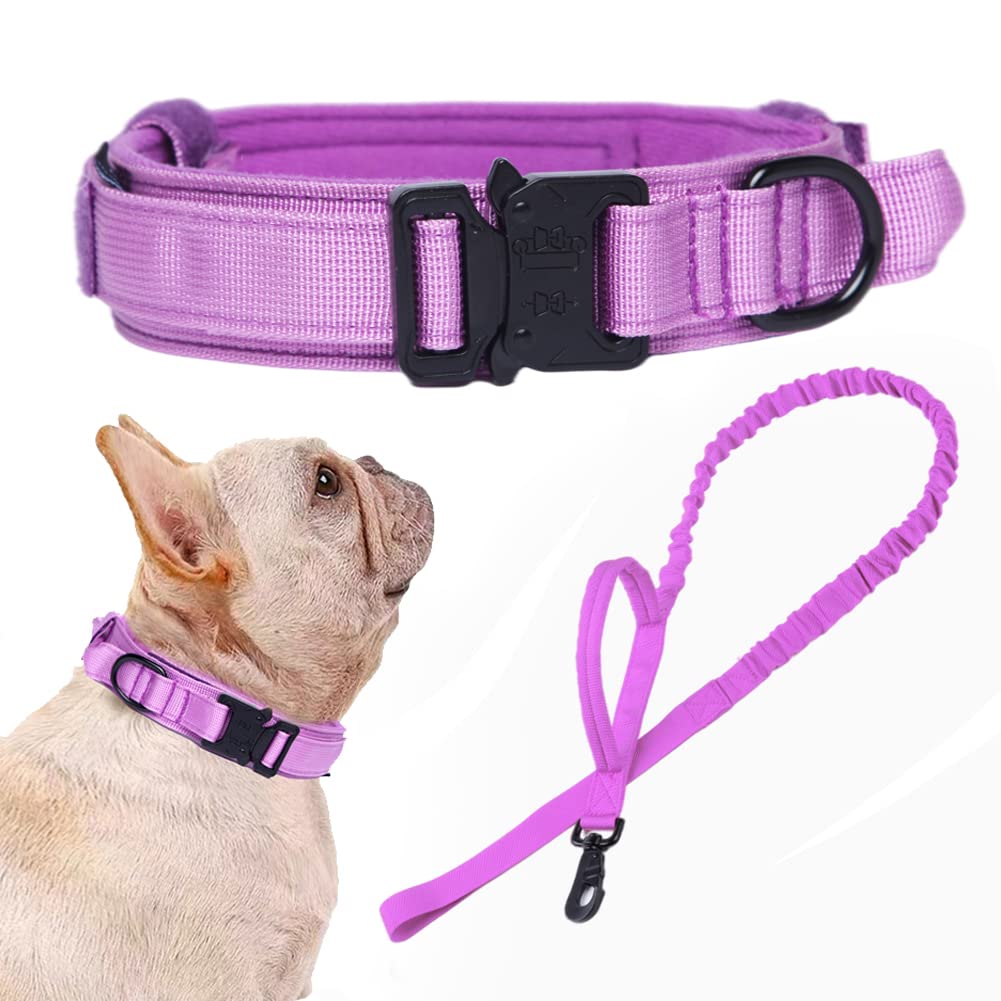Tactical Dog Collar And Leash Set Tactical Dog Collar With Handle Bungee Leash Adjustable Military Training Nylon Collar Dog Training Collar Leash Set With Control Handleand Metal Buckle(Purple S