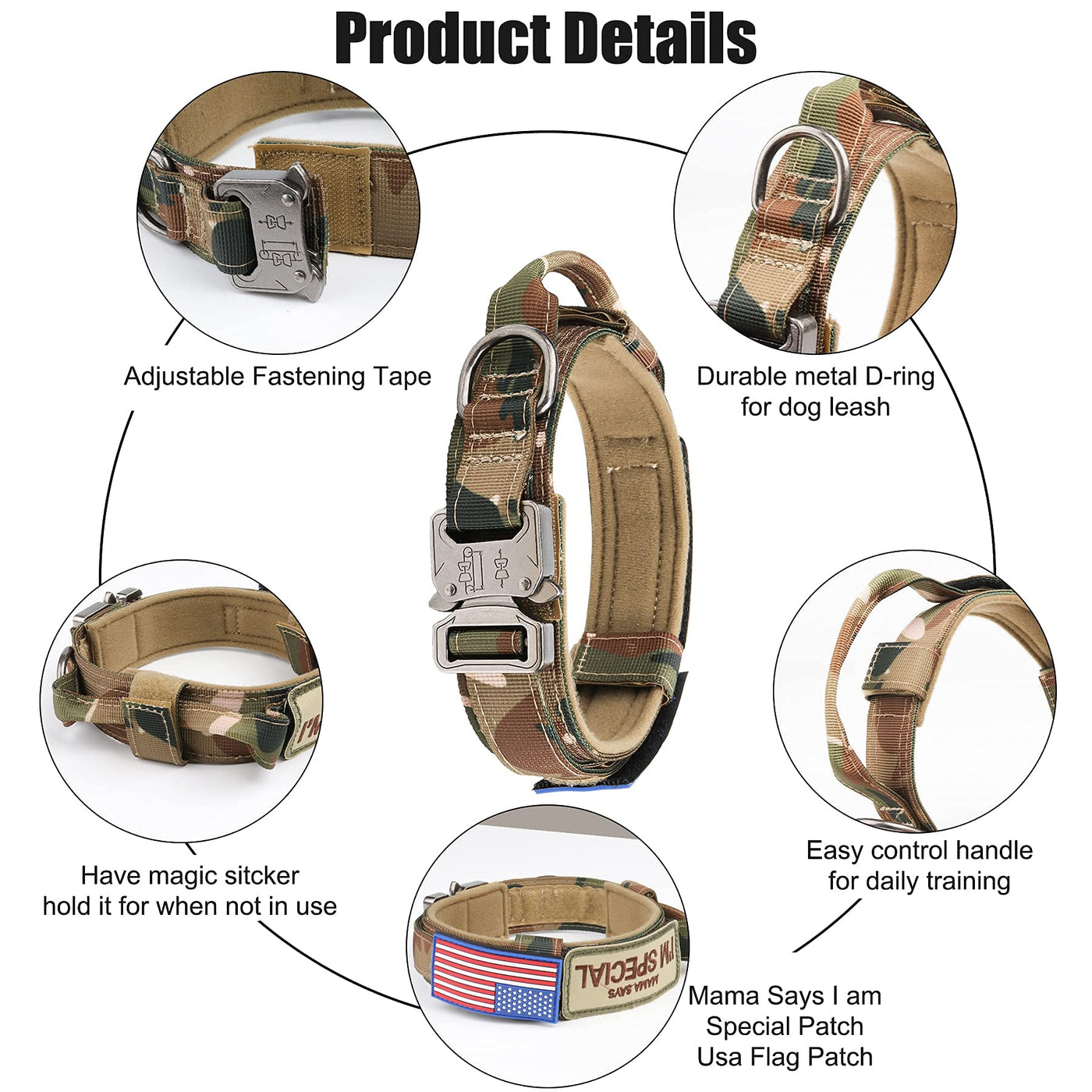 Hello,Your Satisfaction Is Our First Concern. Please Compare With The Detailed Size Of Your Pet Before Purchase. Note : When Measuring The Distance Between The Two Fingers, It Can Ensure The Comfort Of The Dogs Neck. Features: High Durability : Upgrade Dog Collar Are Made Of Sturdy Nylon Fabric And Can Be Used For A Long Time Without Tearing As Easily As Cheap Materials. Strong Material & Parts : Metal Buckle Are Carefully Selected, Heavy Duty And Easy To Plugrelease.And Making No Noise When The Dog Runs. Comfortable To Wear : Padded Lining Is Soft And Will Not Hurt The Skin And Fur Of Your Dog. High-Quality Fabric Will Not Cause Allergies And Can Be Used As Everyday Accessories. Perfect Gift Well-Made Dog Collar Are The Basic Accessories For Daily Training, Outing, Walking, Working,Patrol They Can Be Used For Indoor And Outdoor Occasions, Easy To Control And Comfortable To Handle.Dog Collar Suitable For Medium And Large Dogs, Such As: German Shepherd, Border Collie, Rottweiler, Great Dane, Doberman, Golden Retriever, Husky, Labrador, Alaskan Malamute Etc. Package Includes: 1 X Tactical Dog Collar 1 X Mama Says I Am Special Patch Due To Manual Measurement,Please Allow 0.4Inch(1Cm) Measurement Error.