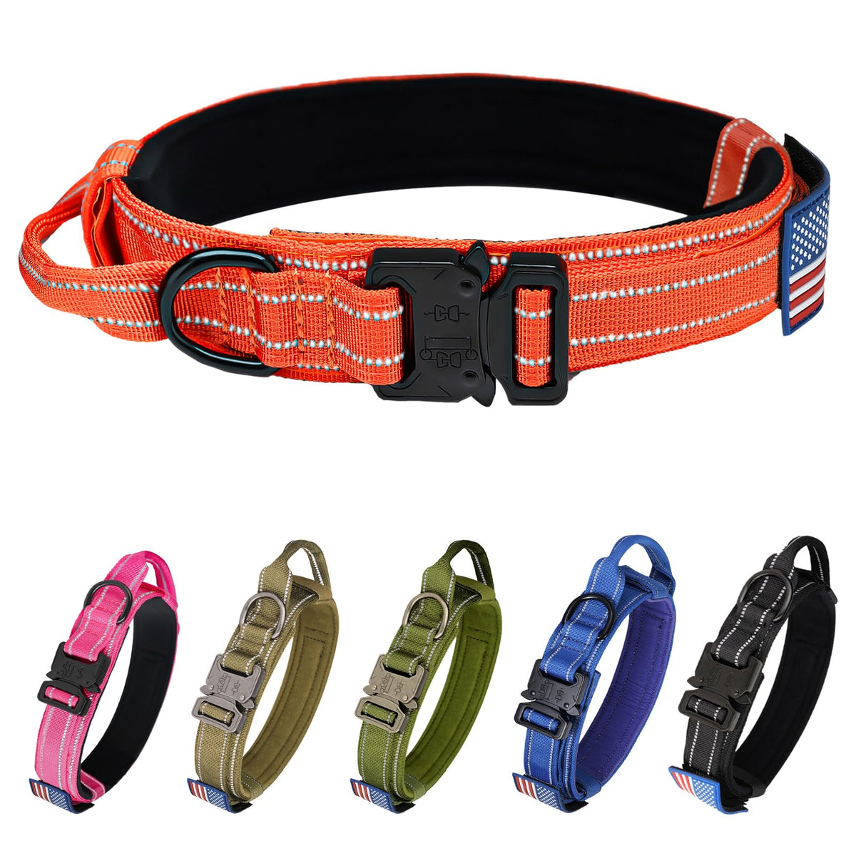 Tactical Dog Collar- Kcucop Military Dog Collar With Reflective Collar And American Flag Patch With Handle Heavy Duty Metal Buck
