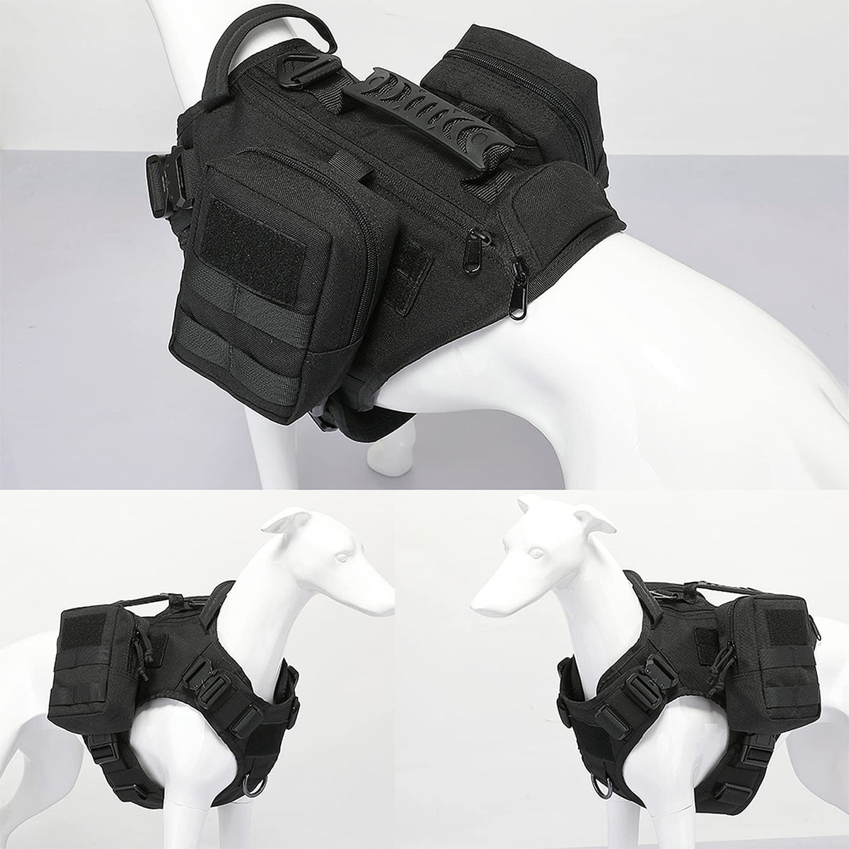 [UNIQUE & ORIGINAL DESIGN ZIPPER BAGS] When the zippers on both sides of the tactical dog harness are opened, the chest harness has an added storage function on both sides. There is also a little bag on the top of the harness for something small like Air Tag or keys. | [STURDY & LAST LONG] 2 metal buckles (1000 lb proof-load test) on dog shoulder position. As here bears the greatest pulling force, this two strong buckles will increase harness service life. Extreme sturdy stitching on each joint and heavy load point. | [Safety Control No Handle] The control handle on the top of the harness allows you to control your dog more effectively, with less effort and no harm to the dog. Better control while training your dog to walk, pull/rush, get in/out with you, which is practical. | [1000D MATERIAL AND SOFT MESH LINING] Outside made of 1000D nylon military-standard material with sturdy stitching, provide extra durability and comfort. Inside made of soft cotton mesh lining, breathable feeding and never rub skin. | [Size] 3 sizes for medium and large breeds. 2 colors, a variety of matching methods, please measure your dog before ordering and choose the size according to the size chart, the molle bag can be selected as needed. Don't choose a size based on your dog's weight or guesswork.