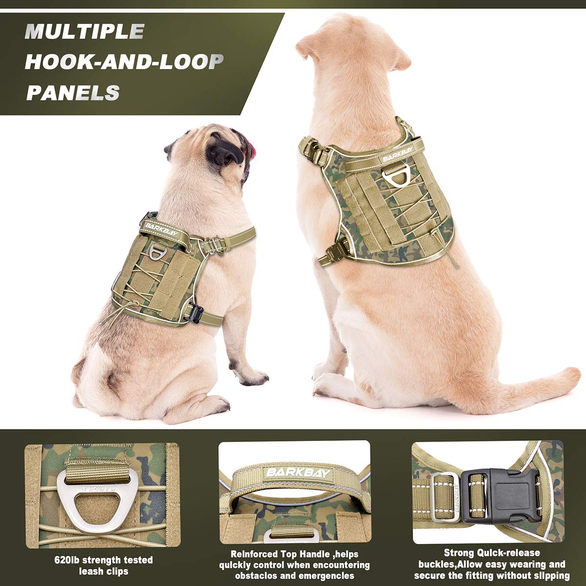 ?MOLLE System & Dog Identified?MOLLE system on for carrying pouches water bottles and essentials. ID panel display area on the chest for Identify Your Dog. The whole package comes with1 tactical dog harness+1 X-bungee+1 SERVICE DOG patch.