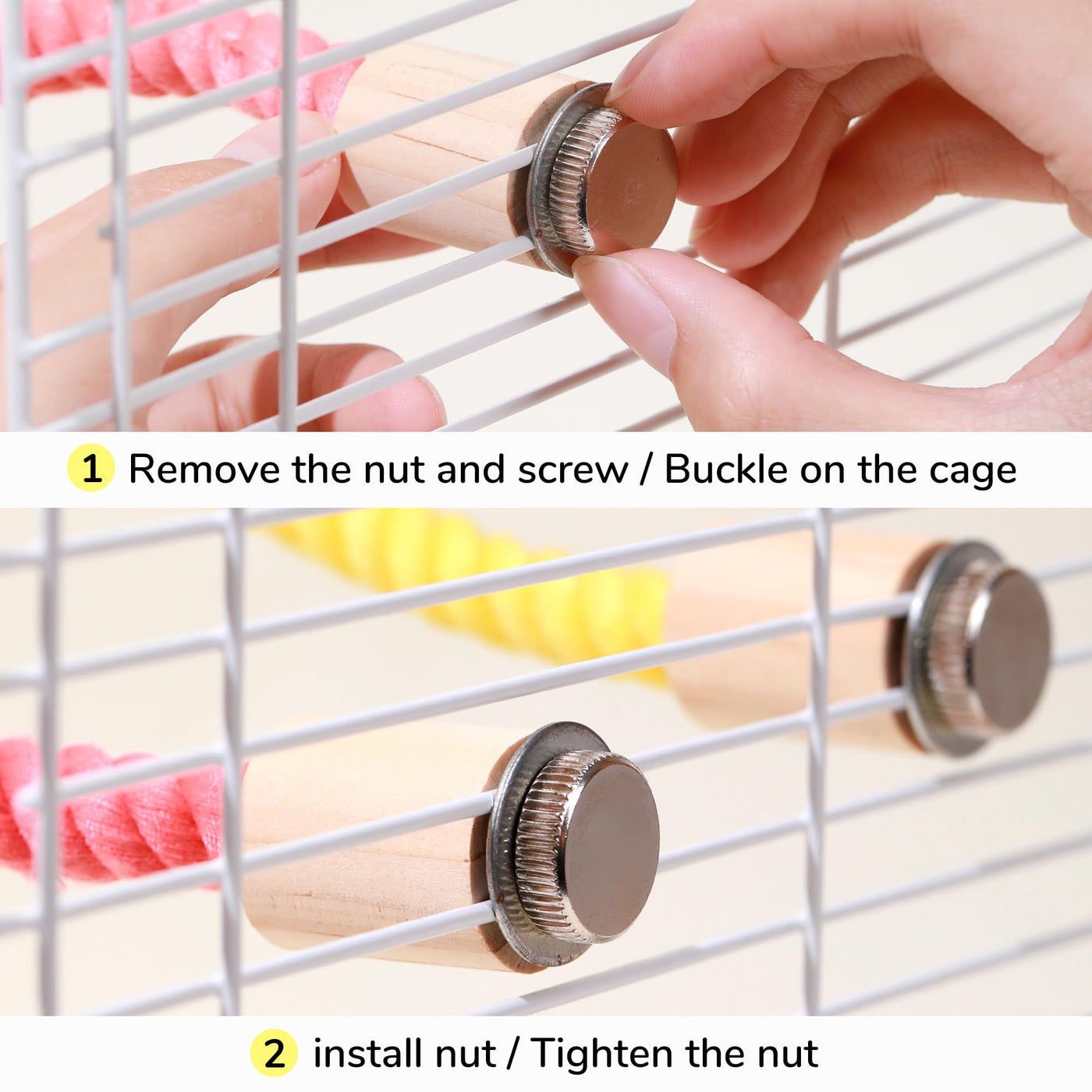 The Tafit bird rope perch offers a hassle-free installation with its flat screw end caps, making it an ideal bird cage accessory. Choose from four different sizes to accommodate various bird cage setups: 15.7, 23.6, 31.5, and 39.4. Each perch is crafted with a unique hand-dyed process, providing a one-of-a-kind unboxing experience with every order.