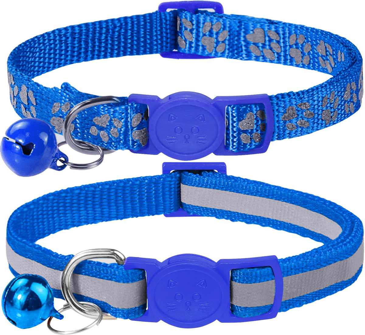 Q: How do the reflective features work on these collars?A: The reflective paw print and stripe designs enhance visibility in low light conditions, allowing you to spot your cat easily at night when illuminated by a flashlight.