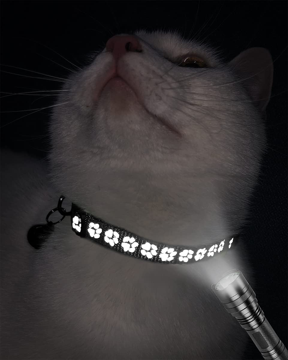 Q: How do the reflective features work in low light?A: The collars feature a highly reflective design that allows you to spot your cat easily in the dark when illuminated by a flashlight, enhancing visibility and safety during nighttime walks.