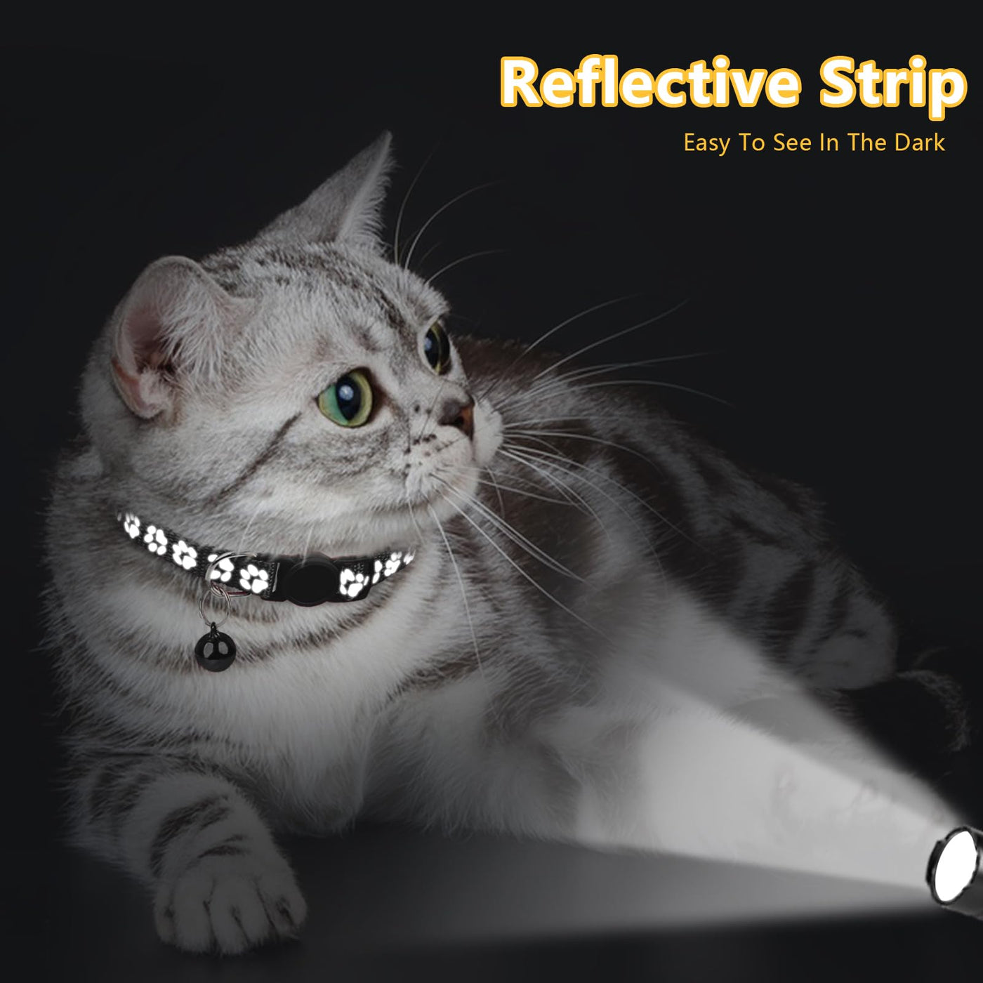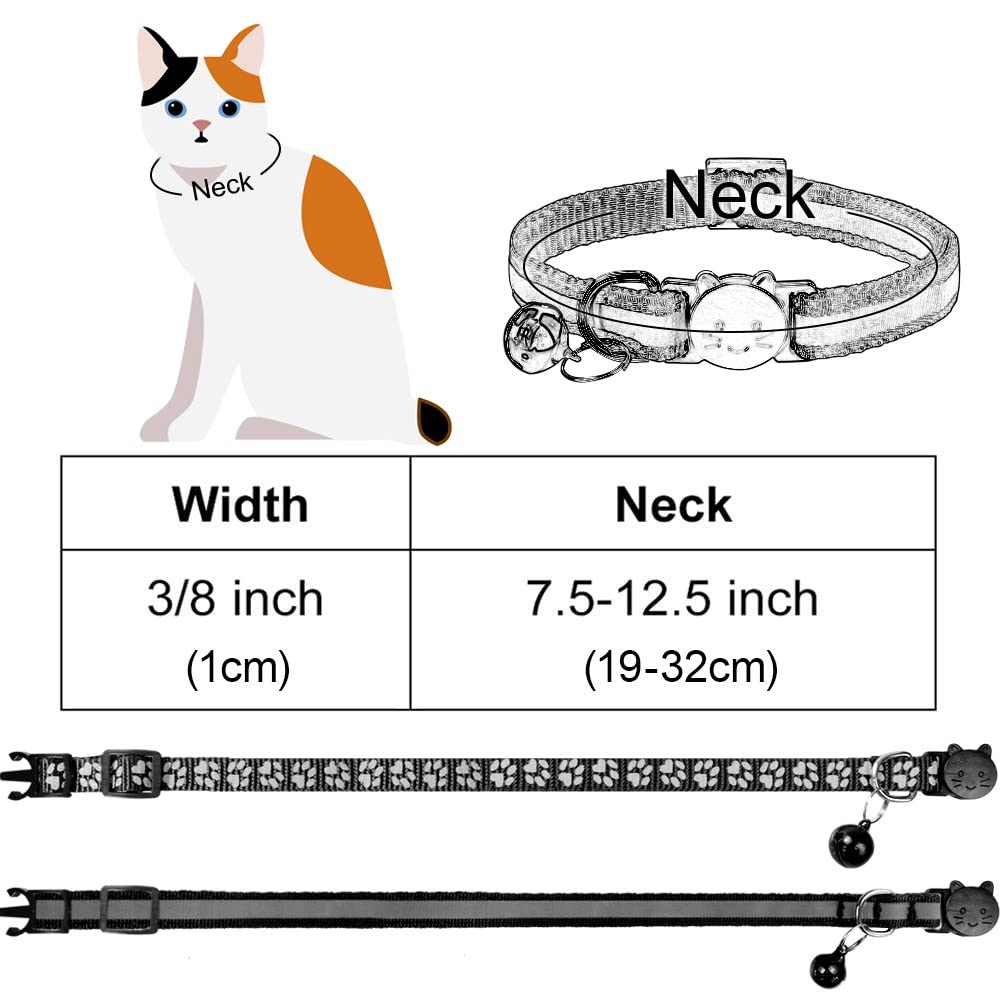 2 PAcK cOLLARS - Package: 1*Black Paw Print collar & 1*Black Strip collar made of durable nylon fabric can stand up to daily use WELL-ATTAcHED BELL is just loud enough to let you know where your catkitty is without being obnoxious Also it is easily removable if needed BREAK-AWAY cLASP will quick release under pressure if your cat get stuck up in something It has just enough resistance in the break away part not breakaway easily Your cats body weight would break it but it will not come off from just scratching at it REFLEcTIVE PAW PRINT & STRIP- Highly reflective design works well to allow you to spot your cat in the dark of night with only a flashlight NEcK SIZE is adjustable for 75-125 38 width lightweight and no sharp edges of rough spots on the insides of the 2 pcs collars to chafe the cats neck