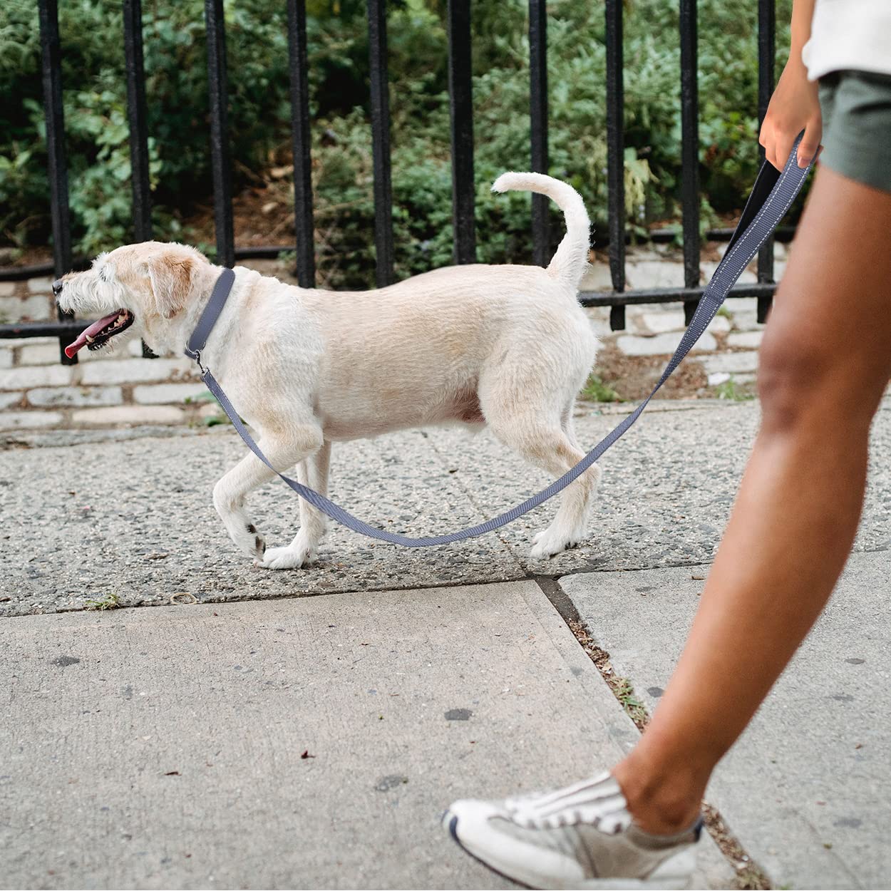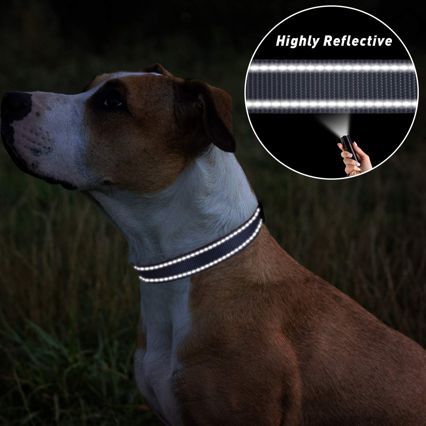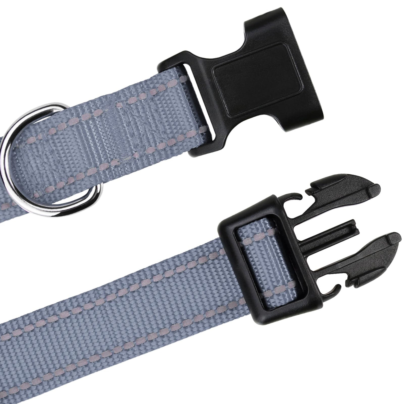 Q: How does the reflective feature enhance safety during nighttime walks?A: The collar features high visibility reflective threads woven into the nylon webbing, which ensure that your dog is easily seen in low light conditions, enhancing safety during nighttime walks.