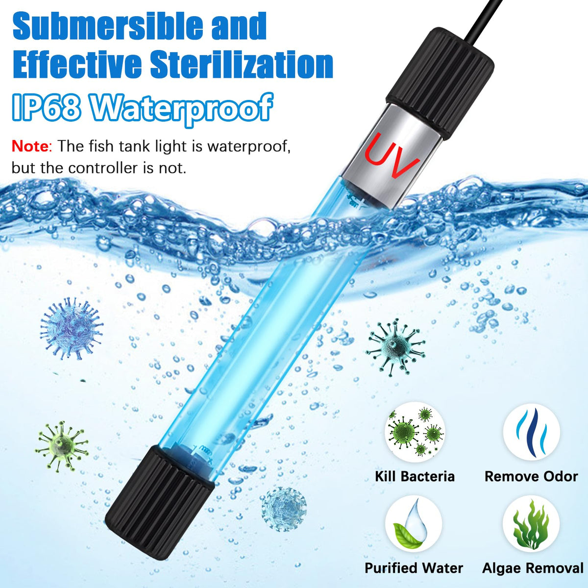 ??Warm Notice:Please measure the size of your aquarium and compare with the dimension of our product before purchase. Instructions: Please do not watch the UV lamp for a long time and avoid the UV lamp irradiating the skin. When using the aquarium disinfection lamp please put it in the filter or use an opaque plate to separate the lamp from the fish to avoid direct light shining on your fish and harm them but please make sure that the water can pass through the plate.