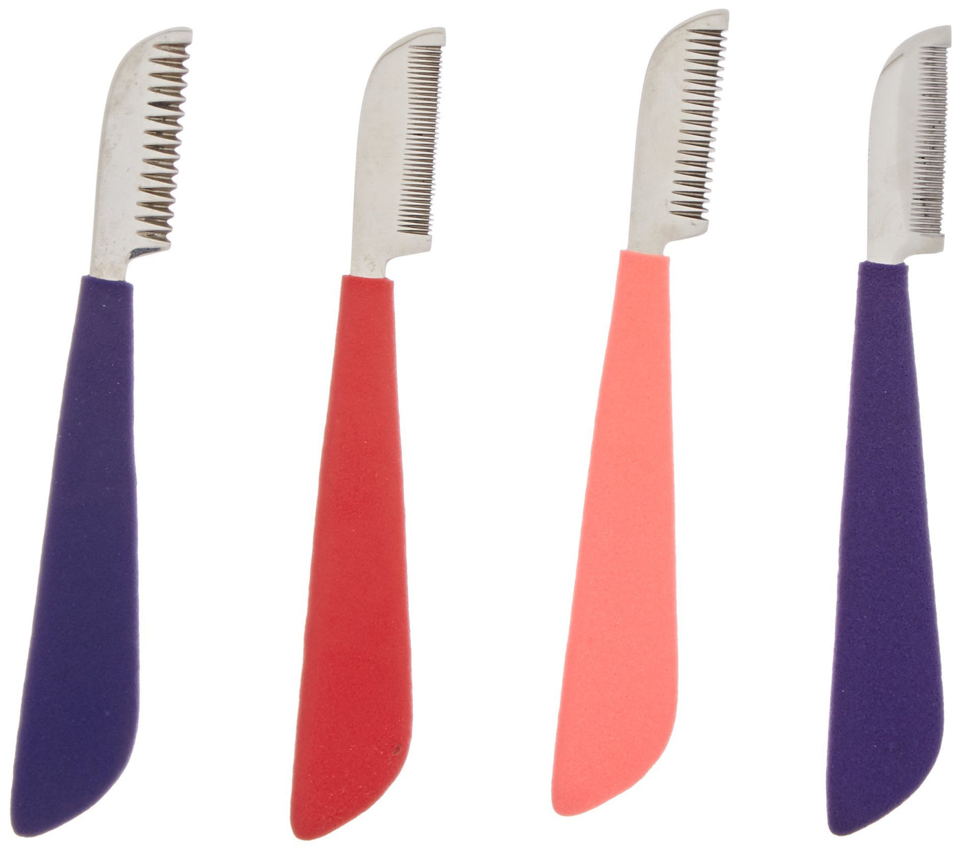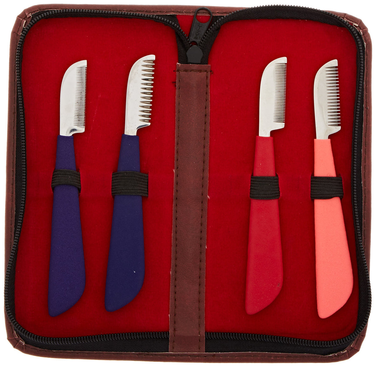 Q: What is included in the TAMSCO Stripping Knives set?A: The TAMSCO Stripping Knives set includes four different knives color-coded from extra fine to coarse, all neatly housed in a convenient zipper case for easy storage and transport.