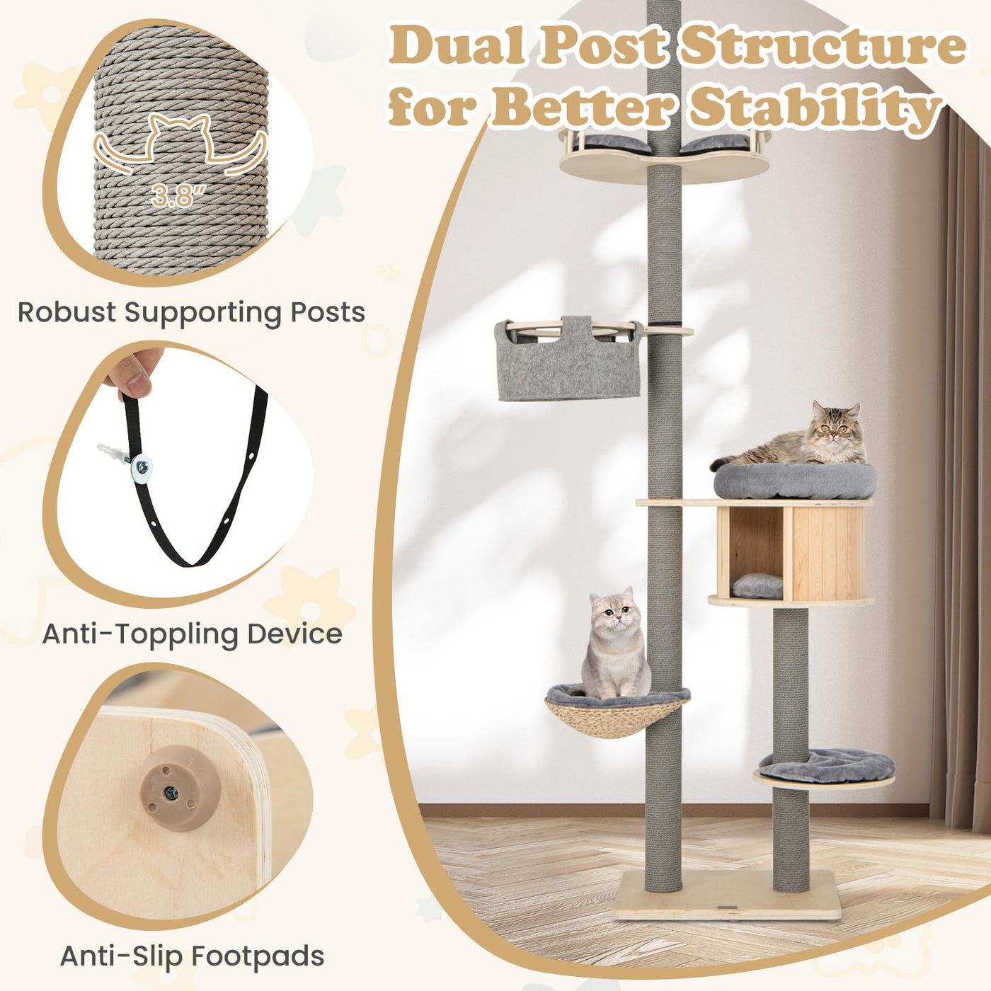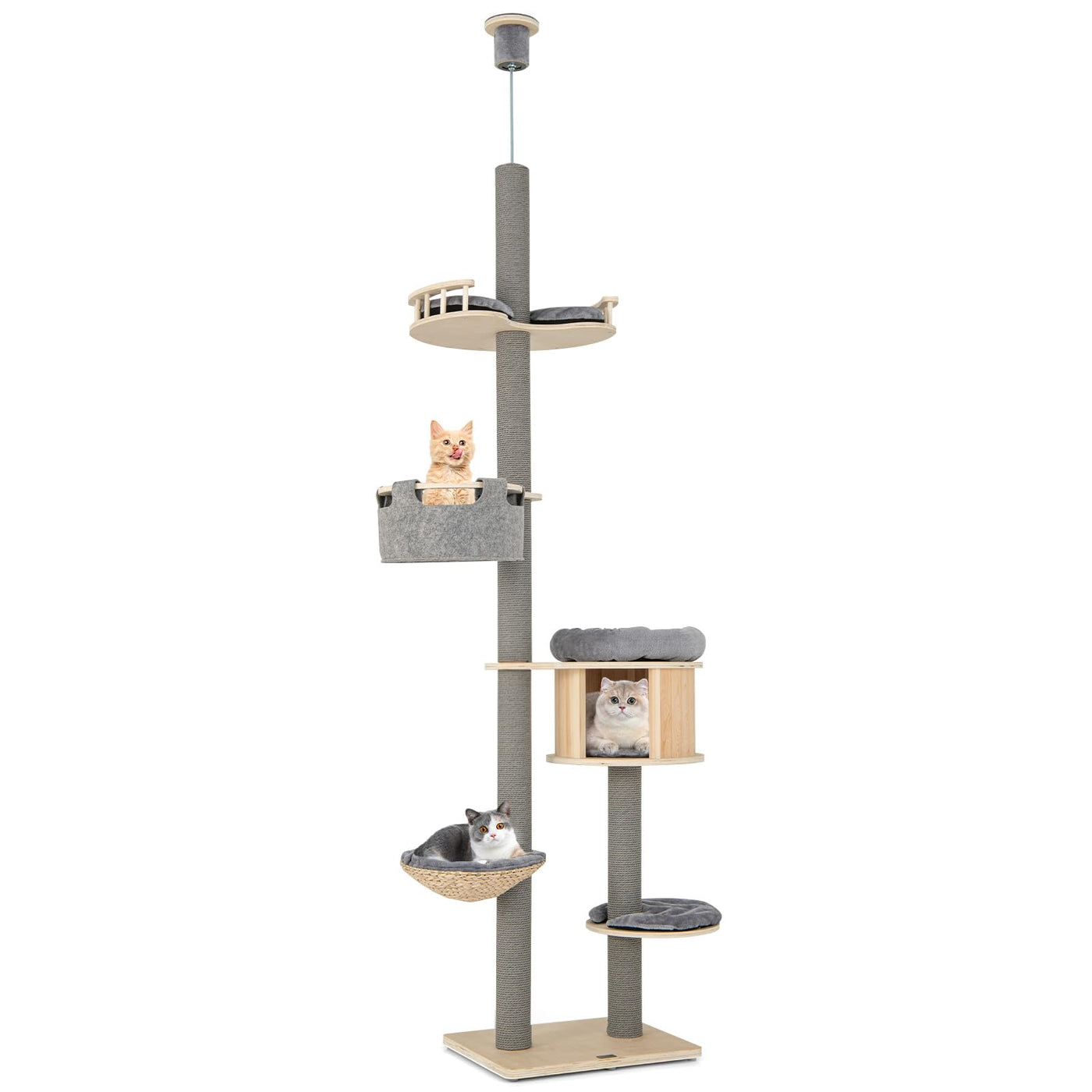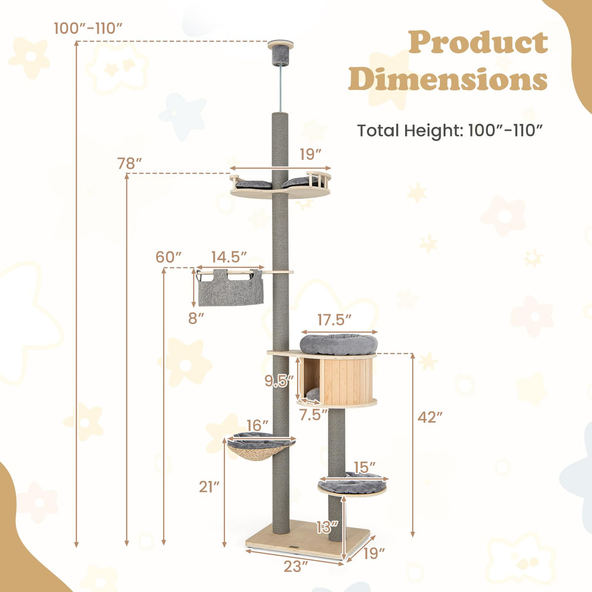 Descriptionelevate Your Cats Playtime!Our Floor-To-Ceiling Cat Tree Measures 23 X 19 X 100 -110 (L X W X H) And Comes With 5 Tiers, Providing Spacious Activity Spaces For Cats To Explore, Scratch, Play, And Relax. The Height Can Be Adjusted From 100 -110 To Fit Different Ceiling Heights. To Enhance Its Stability And Security, The Cat Tree Adopts 2 Thickened Supporting Posts And Anti-Toppling Devices, Preventing Wobbling Or Tipping During Active Play Sessions. Your Furry Friend Will Love The Variety Of Cozy Resting Stations Offered By This Cat Tree, Including A Comfortable Hammock, A Private Cat Condo For Peaceful Retreats, A Round Basket And Soft Bed For Snuggling Comfort. And 2 Long Vertical Scratching Posts Provide A Satisfying Scratching Surface That Helps Keep Your Cats' Claws Healthy. This Floor-To-Ceiling Cat Tower Would Make Your Kittens Day Full Of Excitement!Featurewith An Adjustable Height Of 100 -110 , Suitable For Different Ceilingswith A Metal Fixing Rod, More Stable And Wont Bend, Easy To Install And Adjustthe Metal Rod With Fabric Covering, No Drilling On Ceilings, Would Not Damage Ceilingsthe Thickened Column Ensures A Reliable Structure That Would Not Wobble Or Tip Overadopts A Solid Plywood Frame, Sturdy And Durable, Not Easy To Deformequipped With An Anti-Toppling Device And Anti-Slip Footpads For Enhanced Stabilitythe Fence Springboard Offers An Exciting Platform For Jumping And Exploringthe Solid Pine Wood Condo Frame Offers A Blend Of Durability And Aesthetic Appealthe Comfy Non-Woven Fabric Hammock Resists Scratches, Ensure Long-Term Usethe Hand-Woven Natural Cattail Fluff Basket Is Comfortable, Breathable, And Coolthe Plush Fabric Provides A Warm And Soft Touch For Kittens To Nuzzle On Itthe Plush Cushions And Hammock, Detachable Design For Easy Cleaningthe Fully-Covered Funny Scratching Posts Allow Kittens To Release The Scratching Urgemulti-Layer Fun, Allows Cats To Climb Up To The Highest And Enjoy The Feeling Of Being At The Topspecificationcolor: Grey + Naturalmaterial: Plywood, Plush, Non-Woven Fabric, Cattail, Paper String, Pine Woodsize Of The Base: 23 X 19 (L X W)Adjustable Height: 100-110 Scratching Posts Diameter: 3.8 Each Layer Max Capacity: 22 Lbscat Condo Max Capacity: 33 Lbsnet Weight: 45 Lbspackage Includes:1 X Floor-To-Ceiling Cat Tree1 X Users Manual