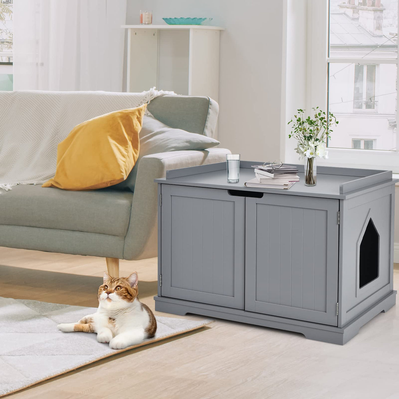 Tangkula Litter Box Enclosure, Cat Litter Box Furniture Hidden, Nightstand Pet House With Double Doors, Indoor Decorative Cat Bo