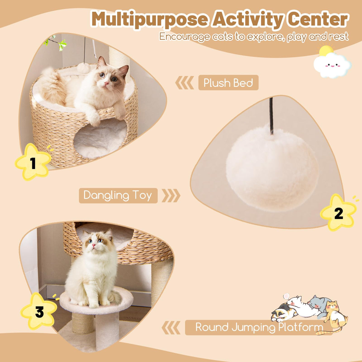 Descriptionenrich Your Cats Daily Life With Our Modern Cat Tree.Equipped With An Interactive Toy, Top Perch, Large Condo, Plush Bed, And Platform, The Multipurpose Activity Center Will Encourage Cats To Explore, Play And Rest. Crafted With Cattail Fluff, The Condo And Large Perch Provide Breathable And Natural Environment For Your Cats. Besides, The Condo And Perch Are Equipped With Washable Plush Cushions, Which Create A Cozy And Clean Environment For Your Furry Companions. Additionally, The Fully Wrapped Sisal Scratching Posts Can Meet Cats Natural Instinct To Scratch And Protect Your Furniture From Damage. Thanks To The Anti-Tipping Device And Wide Base, There Is No More Wobbling Or Tipping Over. Featuring Natural Woven Cattail Fluff And White Plush, The Multi-Level Cat Tree Will Complement Your Room Style Easily!Featurecattail Fluff Made Condo And Perch Are Breathable, Natural And Long-Lastingtop Perch Provides Vintage Point To Overlook The Worldspacious Cat Condo Is A Cozy Hideaway Offers A Sense Of Privacyplush Bed Provides Extra Space For Cats To Take A Napfully Wrapped Scratching Posts Are Made Of Selected Sisal Materialdangling Toy And Round Platform Stimulate Cats Instinct To Hunt And Jumpanti-Tipping Device Will Firmly Anchor The Cat Tree To Wallwide & Thick Base Ensures Unmatched Stability Removable Plush Cushions Will Provide A Soft And Warm Touchmachine Washable Cushions Offer A Clean Environment For Catsspecificationcolor: White + Naturalmaterials: Sisal, Solid Plywood, Cattail Fluffoverall Height: 41(L X W X H)Base Size: 20 X 16(L X W)Perch Size: 15 X 3(Dia. X H)Cat Condo Size: 17.5 X 15 X 11(L X W X H)Bed Size: 17.5 X 15(L X W)Platform Diameter: 11Net Weight: 22 Lbseach Layer Maximum Weight: 33 Lbspackage Includes:1 X Cat Tree1 X Users Guide