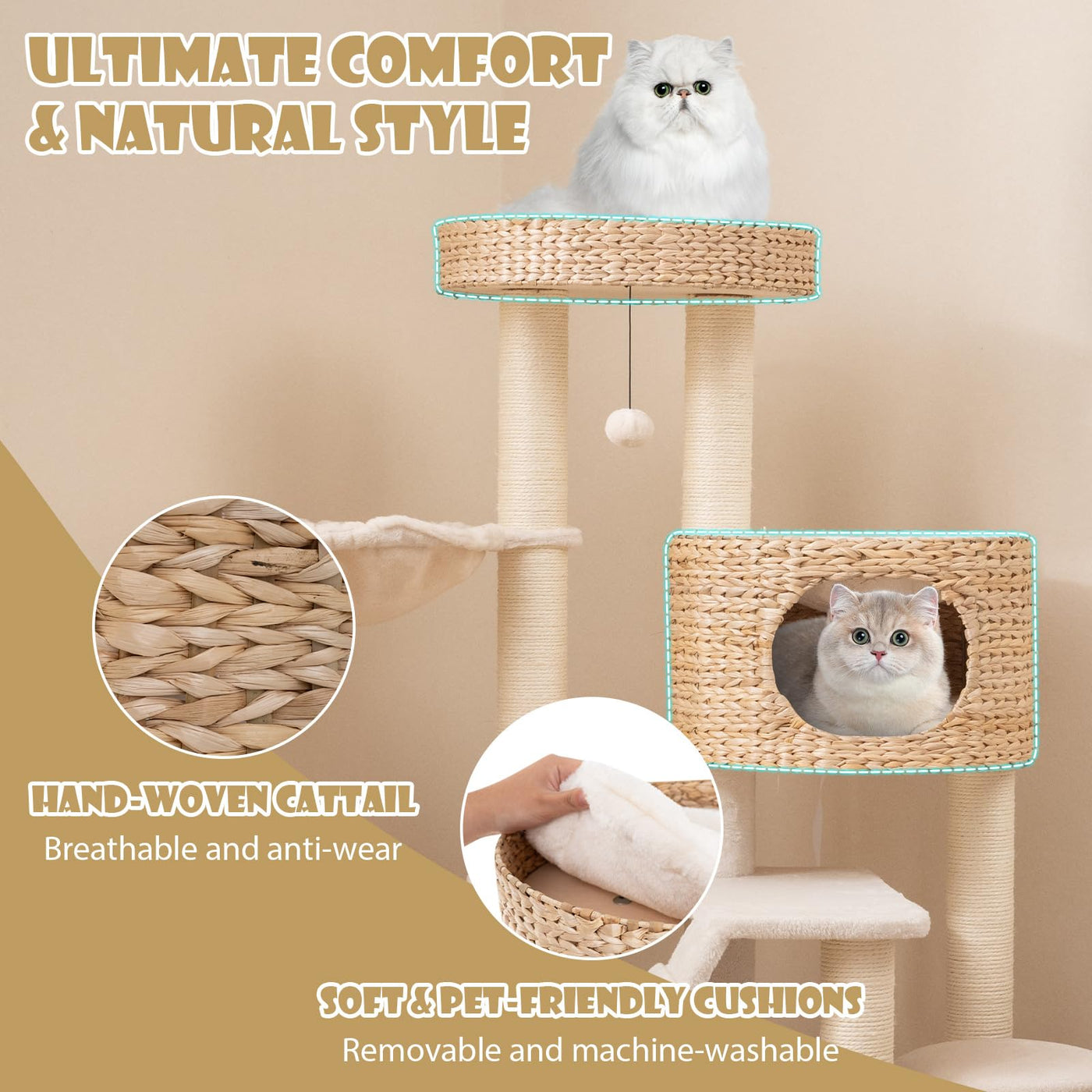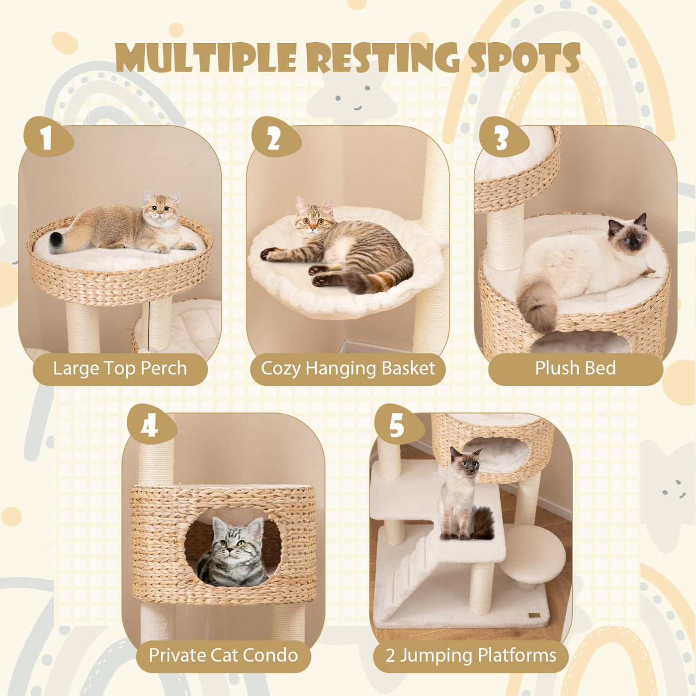 Descriptionpamper Your Feline Friends With Our Multi-Level Cat Tree, Crafted For Enduring Pleasure. At A Total Height Of 50 Inches, This Cat Tower Serves As A Comprehensive Activity Center That Incorporates A Variety Of Engaging Features To Keep Your Indoor Cats And Kittens Entertained And Active. It Includes A Cattail Fluff Condo For Privacy And Relaxation, A Top Perch For Observing Their Surroundings, A Hanging Basket For Cozy Naps And 2 Platforms For Lounging And Jumping. The Inclusion Of A Sloping Ladder Allows Cats To Stretch Out, Climb Up And Down. Additionally, Engagement Is Heightened By A Playfully Placed Dangling Ball. The Sisal Scratching Posts Promote Healthy Scratching Habits And Protect Your Furniture. For Added Safety, The Cat Tree Comes With An Anti-Tipping Strap. Featurea Variety Of Spots For Cats To Rest, Play, Climb And Moresoft And Warm Plush Covering For Ultimate Comfortsisal Scratching Posts Meet Cats' Scratching Naturedangling Ball And Ladder Keep Cats Entertained And Active Anti-Tipping Strap To Fix The Cat Tree To The Wall For Added Security Enlarged & Thickened Base Ensures Better Stabilityhand-Woven Cattail For Both Elegance And Durabilitymulti-Level Fun And Satisfy Several Cats' Needs Natural Style Blends With Any Home Decorationsmachine-Washable Cushions For Easy Cleaningspecificationcolor: White + Naturalmaterials: Sisal, Solid Plywood, Cattail Fluffoverall Height: 50'(L X W X H)Base Size: 28' X 20'(L X W)Top Perch Diameter: 16'Hanging Basket Diameter: 15'Net Weight: 44 Lbsweight Capacity Of Each Layer: 33 Lbspackage Includes:1 X Cat Tree1 X Anti-Tipping Device1 X Users Guide
