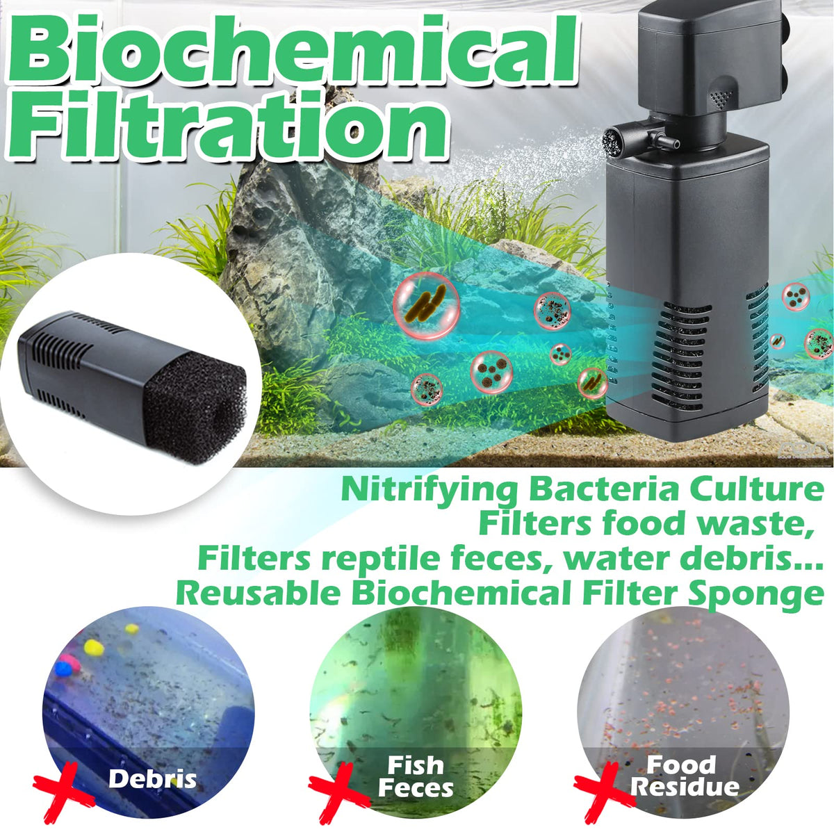 Q: How does the biochemical filter sponge work in this aquarium filter?A: The black biochemical filter sponge effectively reduces odors and yellowing by decomposing waste and leftover food, which helps maintain a clean and healthy environment for your fish.