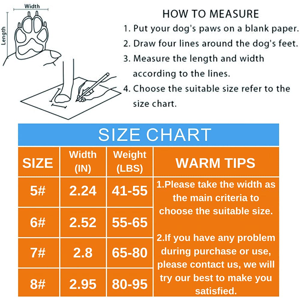 Warm Tips:Please measure your dogs feet size refer to the instruction in the picture before placing order. Take the WIDTH as the main criteria.Size:5#: 2.24 ' ' Width for 41-55 lbs;Reference Varieties: Whippet, Belgian Malinois, Shetland Sheepdog 6#: 2.52 ' ' Width for 55-65 lbs; Reference Varieties: American Pit Bull Terrier, American Water Hound 7#: 2.8 ' ' Width for 65-80 lbs; Reference Varieties: Welsh Spaniel, Golden Retriever 8#: 2.95 ' ' Width for 80-95 lbs; Reference Varieties: Rottweiler, German Shepherd Features: Waterproof & Anti-Slip Sole: Teamoo dog shoes are made of soft waterproof fabric, waterproof high quality leather and durable non-slip sole, therefore they can prevent your love dog from wet, dirty feet and slip. They are practical in wet and dry, hot and cold conditions. Indoor & Outdoor Practical: Indoor: Protect your sofa, carpet or car seat from sharp dog claws. Outdoor: Protect your dog 's paws from dirty/hurt in the snow/dirt/hiking/sidewalk/rocks/hot/cold. Adjustable Reflective Strap: The adjustable reflective straps of Teamoo dog boots are durable and long enough, they can supply a customized tightness secure closure and more safe night walking for your dog. Not only keep your dog safe at night, but also make sure your dog 's comfortable. Superior Service: Amazon Prime Supported, 15 Days No Reason Return. 24-hours Customer Service Online.