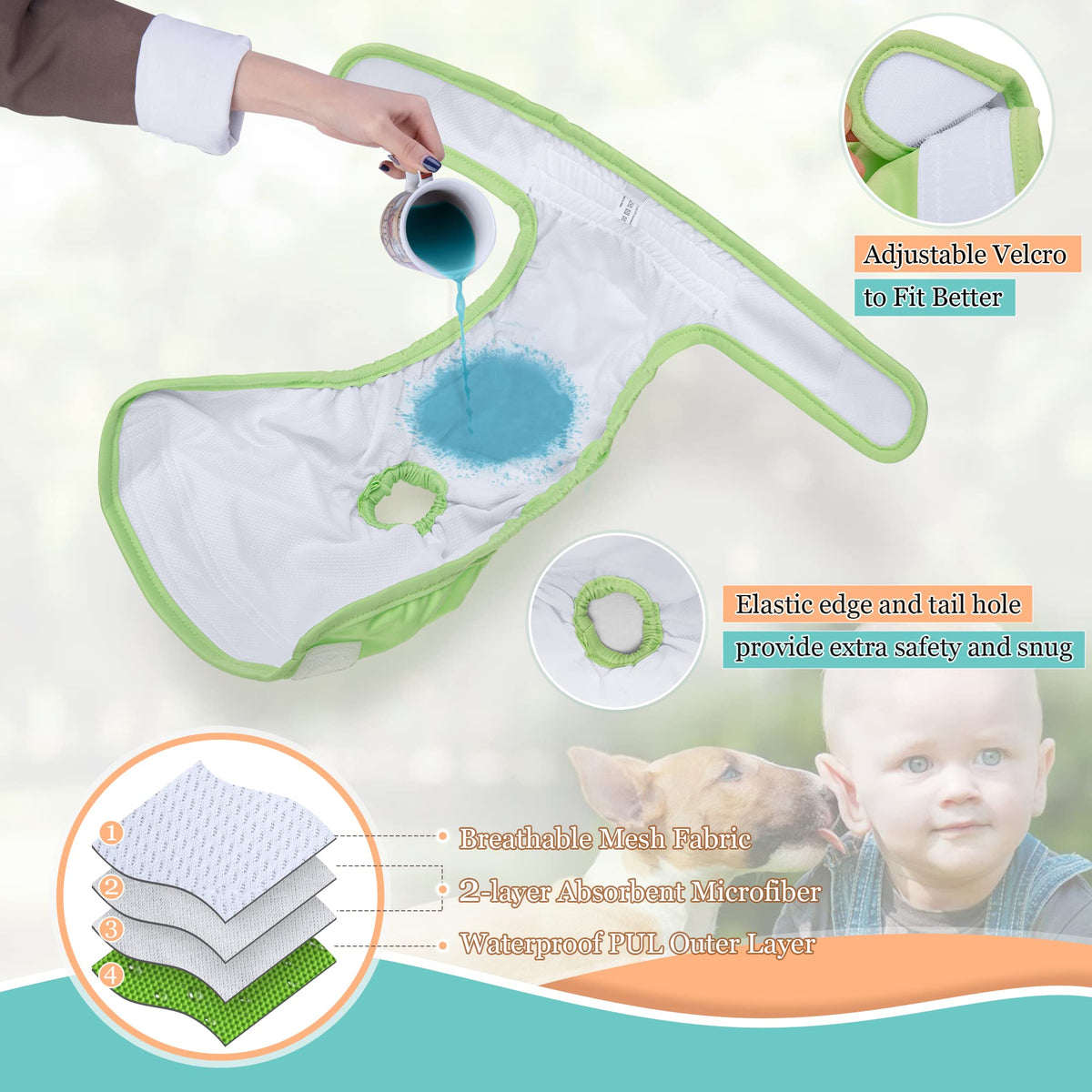 COMFORTABLE: 4 PACK Of DOG DIAPER. Specially design for female dogs with 2-layer super-absorbent microfiber waterproof PUL outer layer to prevent leaks and spills. Breathable soft and good permeability mesh fabric close to the skin Not chafing to your dog.