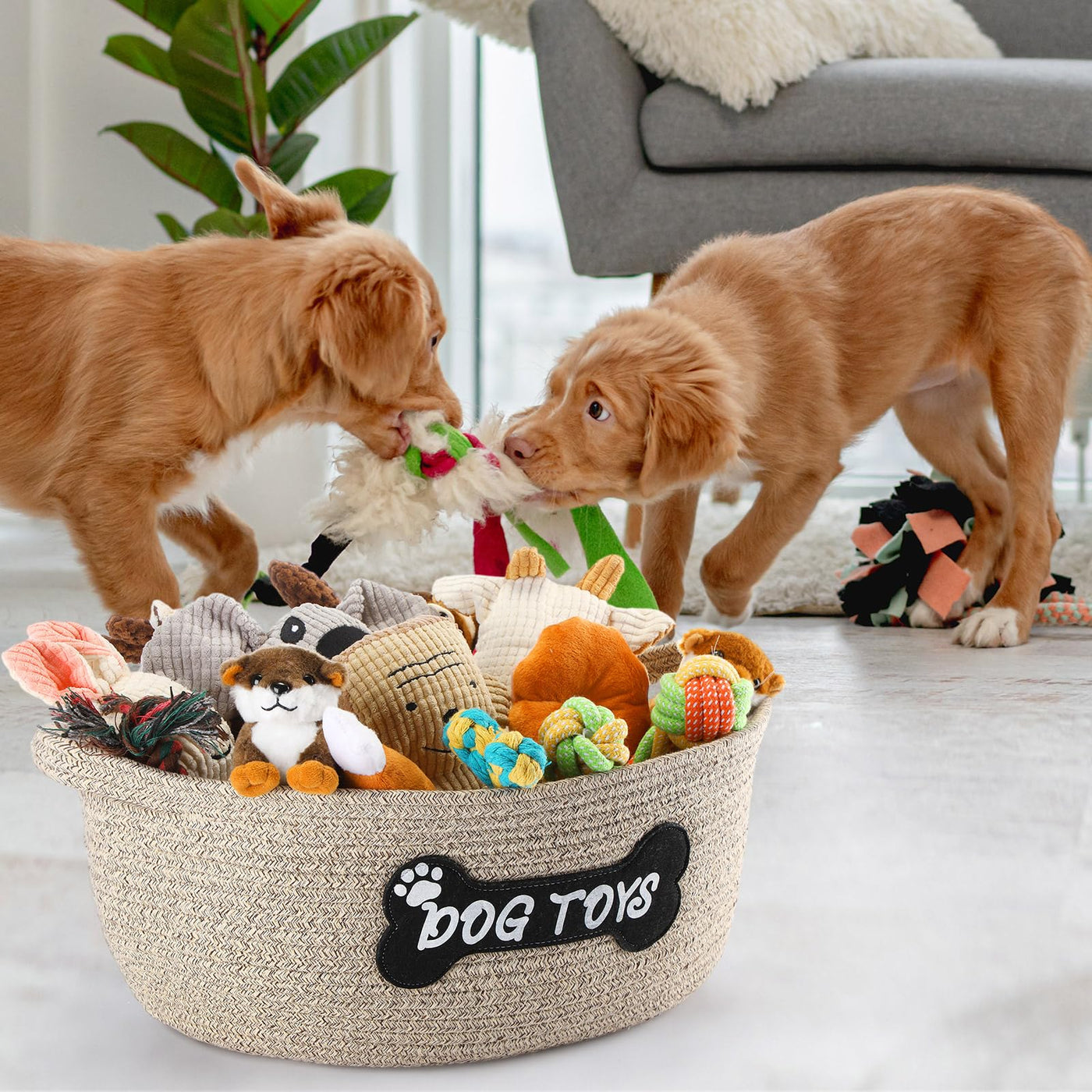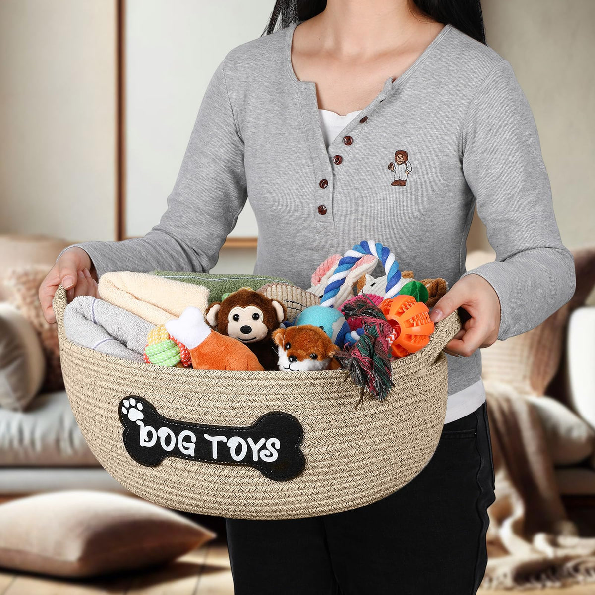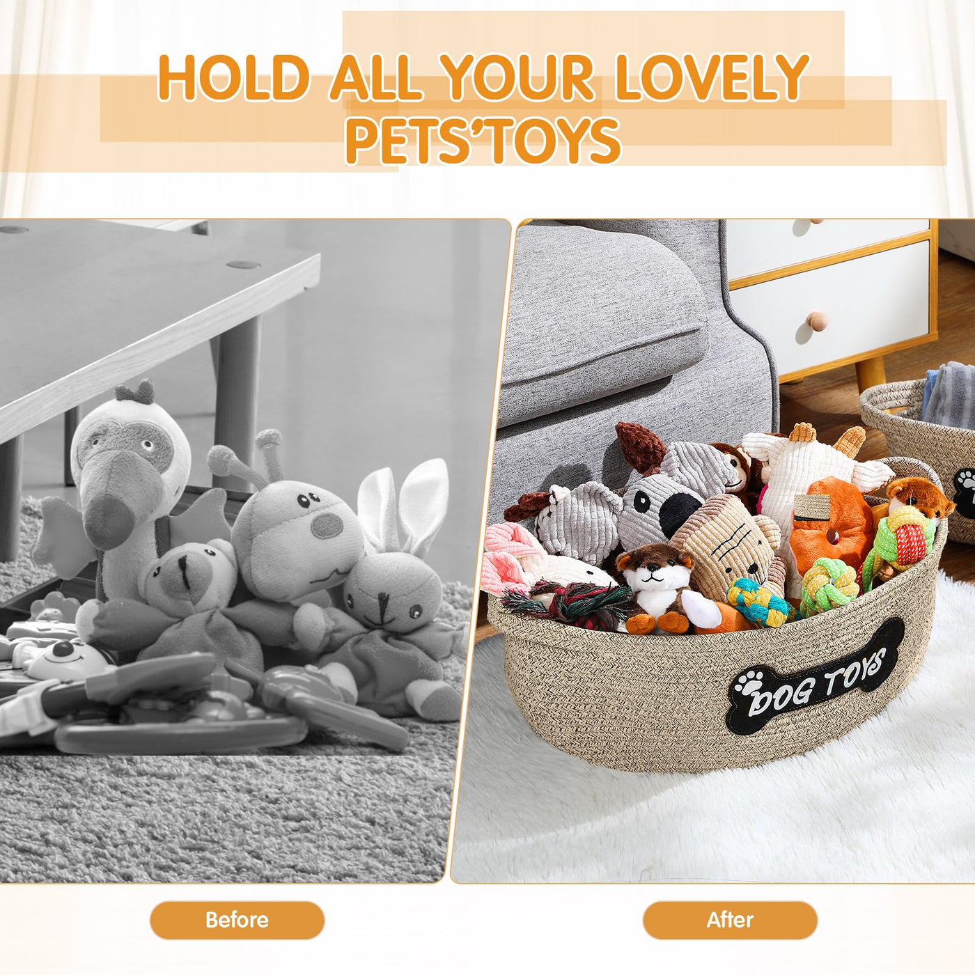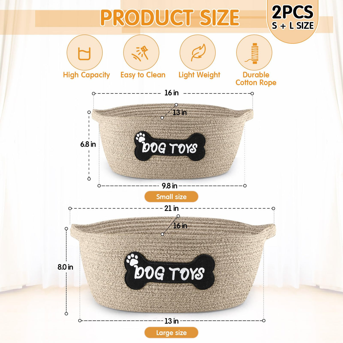 Features: The Woven Pet Toys Use Gentle Beige Design, Which Color Options Blend Well With Your Decor And Personal Preferences. You Can Be Proud To Put These Woven Clothes Basket In Any Corner Of Your Home. This Pet Bin Will Not Shed And Has No Loose Parts That Will Pose As A Safety Or Choking Hazard. The Cute Patch Is Sewed Securely Onto The Pet Basket. Specifications: Material: 100% Cotton Rope Color: Beige Size: Large One: About 21 X 13 X 8 Inch Middle One: About 16 X 9.8 X 6.88 Inch Package Includes: 2 X Dog Toy Baskets Notes: Manual Measurement, Please Allow Slight Errors On Size. The Color May Exist A Slight Difference Due To Different Screen Displays.