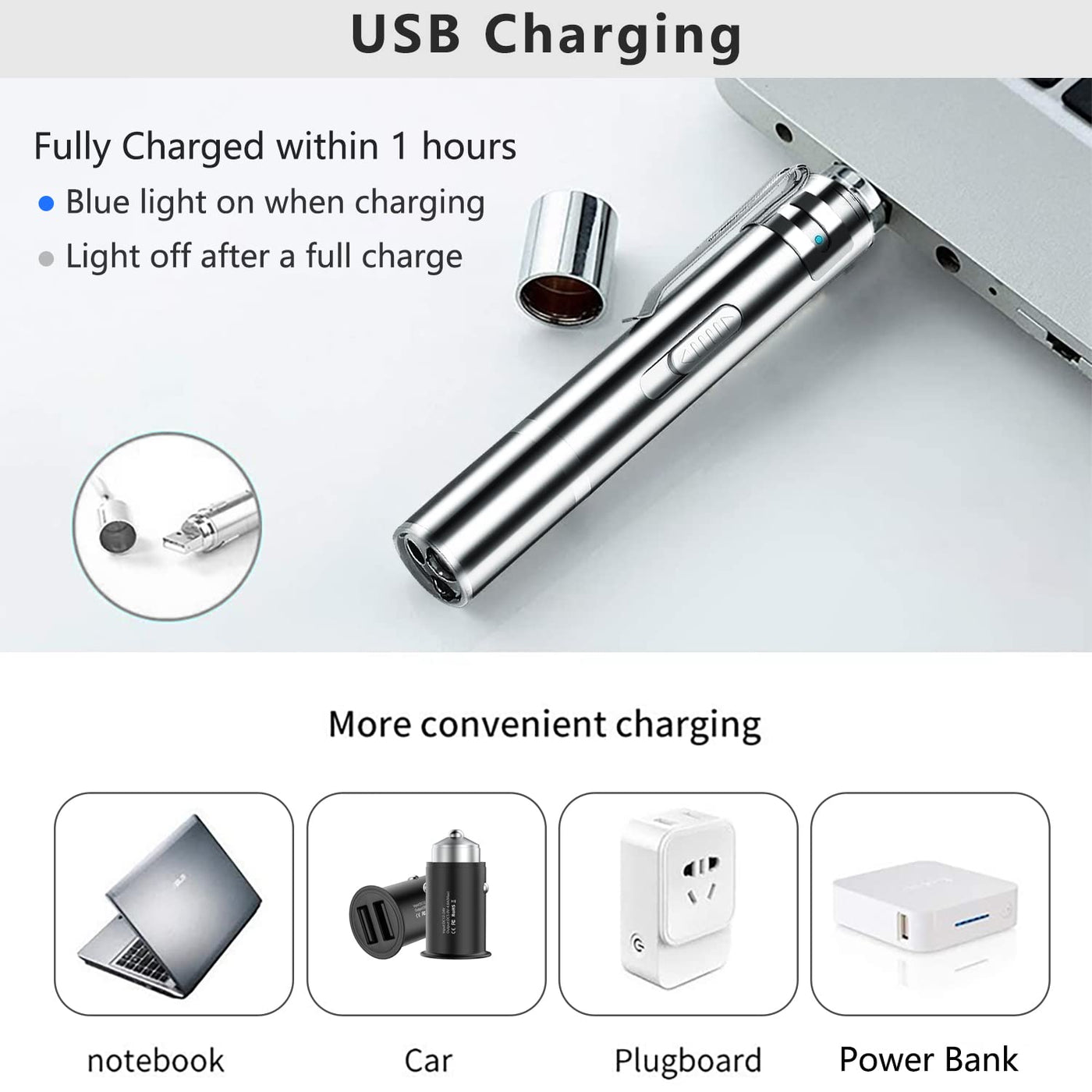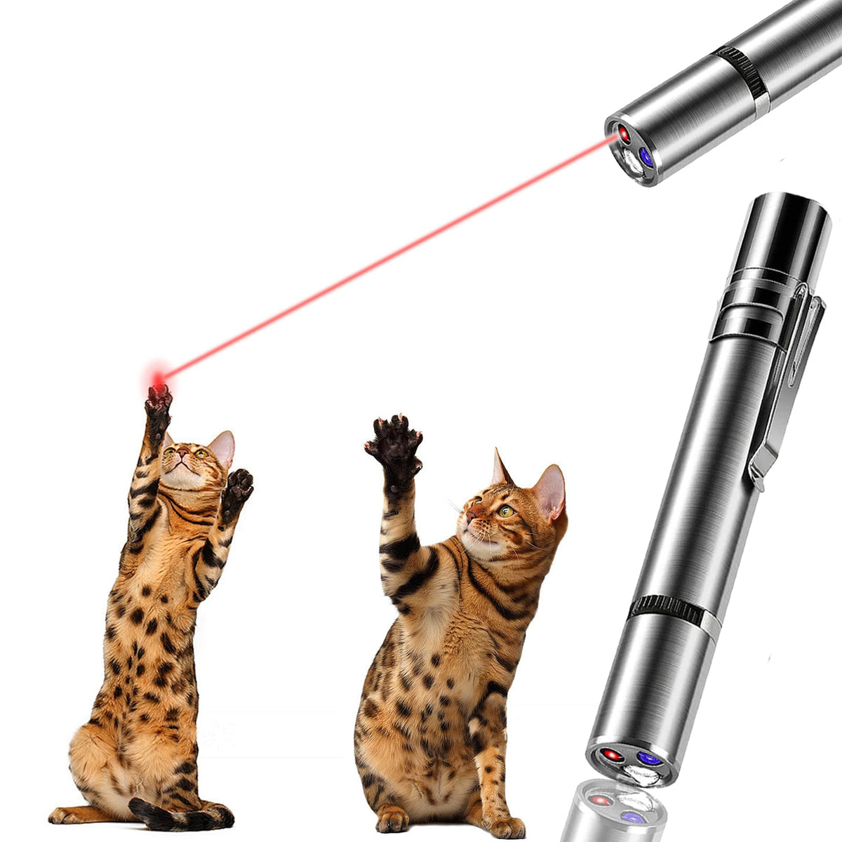 This laser pointer cat toy has a metal shell, and it has 7 modes. The first is a laser with 5 modes: red dot, star, smiley face, mouse and butterfly. These modes of laser pointer are what kittens and puppies love to chase and play with. Shine the laser on the floor and your little pet will have a blast. Running around after the laser patterns will not only exercise your pet, but also relieve pain. Relieve her anxious mood, in the process of interacting with dogs and cats, the same owner is also very happy. The 6th mode is flashlight mode, this small flashlight can help you illuminate the road in the dark night, very convenient for you to travel at night for a short time. The third is the blue light mode, this blue light can help you to recognize counterfeit money, find the excrement of kittens and dogs and clean them. The laser pointer is USB rechargeable and can be used for more than 5 hours on a single charge. This product is very lightweight and compact, weighing only 25 grams, with a length of 4.5 inches and a diameter of 1.3 inches. It is very convenient to carry. It is a good helper for interacting with dogs and cats and traveling at home.