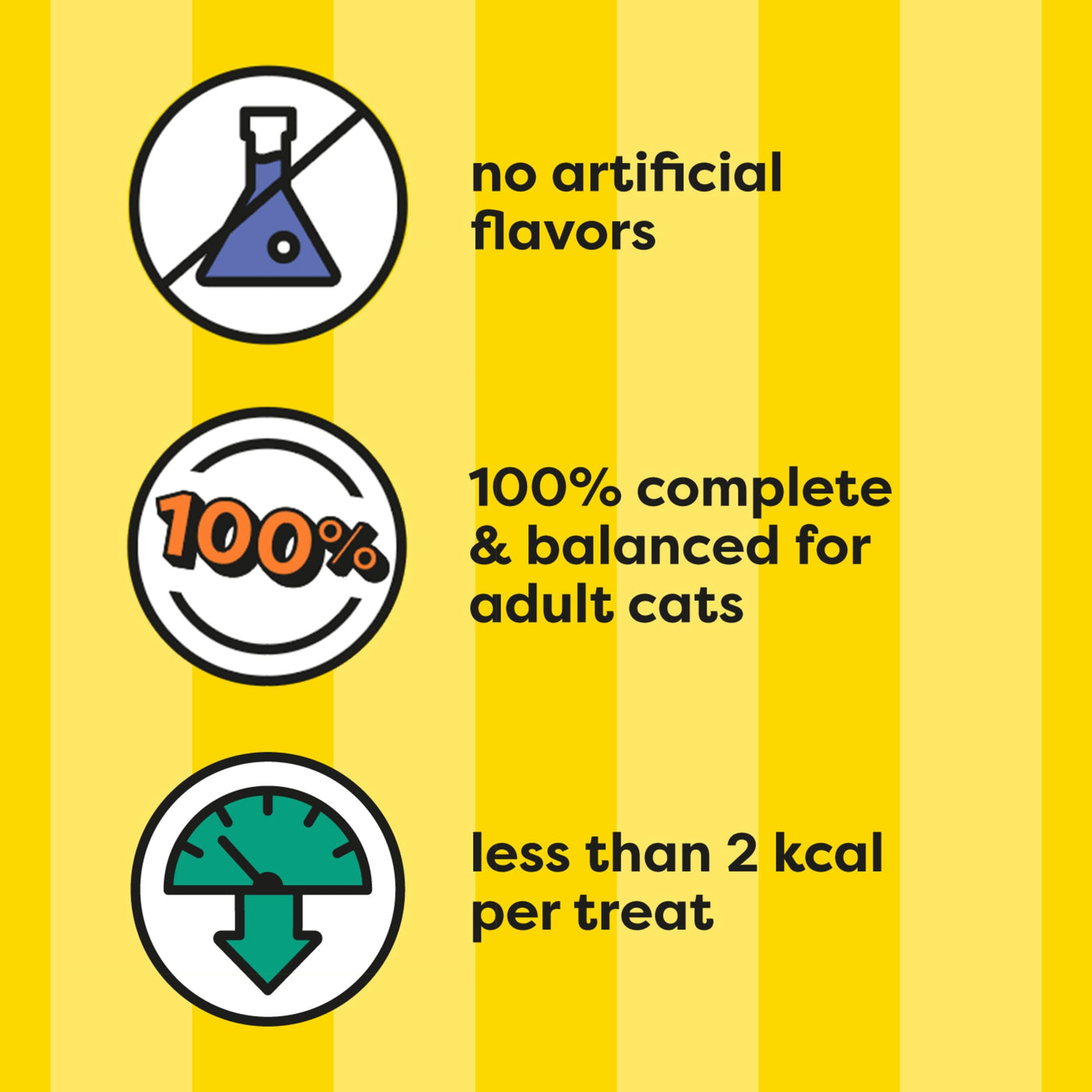 Reward your cat with scrumptious playtime cat snacks that are 100% nutritionally complete for adult cat maintenance and that help to control tartar. Featuring a tempting mix of flavors, such as chicken, catnip and cheese, TEMPTATIONS MixUps variety cat treats are a great-tasting playtime reward. Theyre the perfect size treats for cat toys, so try placing a few inside a treat dispenser toy and watch your cat chase and swat away. Plus, at only 2 low calories per treat, your feline friend can enjoy the crunchy outside and soft center anytime. Americas #1 cat treat* is the perfect way to show your feline friend how much you care. (* Based on 2020 Nielsen sales data). Crunchy outer shell helps to control tartar and support dental health.No artificial flavors for an amazing taste your cat will love.