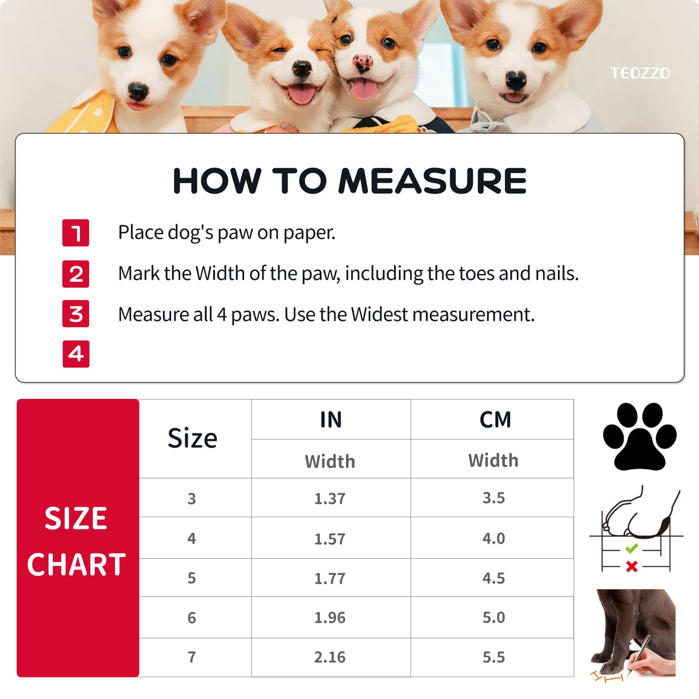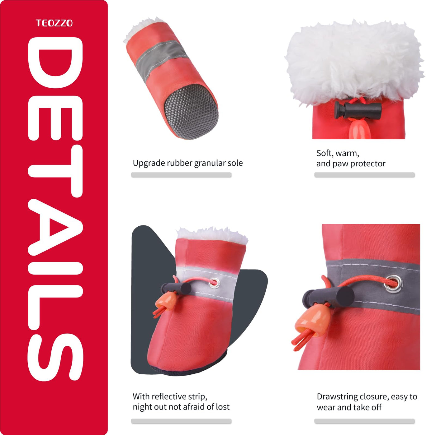 Teozzo Dog Boots &Amp; Paw Protectors Details:&Nbsp;1.&Nbsp;The Dog Shoes Use A Durable Non-Slip Granular&Nbsp;Sole To Provide Stability And Traction, Helping Pets Maintain Mobility And Stability On Tiles And Sand. Effectively Protect Dog Paws From Harm.2.&Nbsp;This Winter Dog Boot, With Super Soft Fleece Inside, Provides Extra Comfort, Keeps Paws Warm In Cold Weather.3.&Nbsp;These Dog Boots Can Also Be Applied In Summer, Protected Dog Paws From Hot Pavement, Stones.4.&Nbsp;Our Dog Paw Protectors Are Not Waterproof But Can Keep Paws Dry, Warm.5.&Nbsp;Reflective Lines Enhance Visibility All Night, Ergonomic Shape, Maximize The Comfort And Support Your Dog 'S Paws Need. To Ensure The Safety Of The Dog.