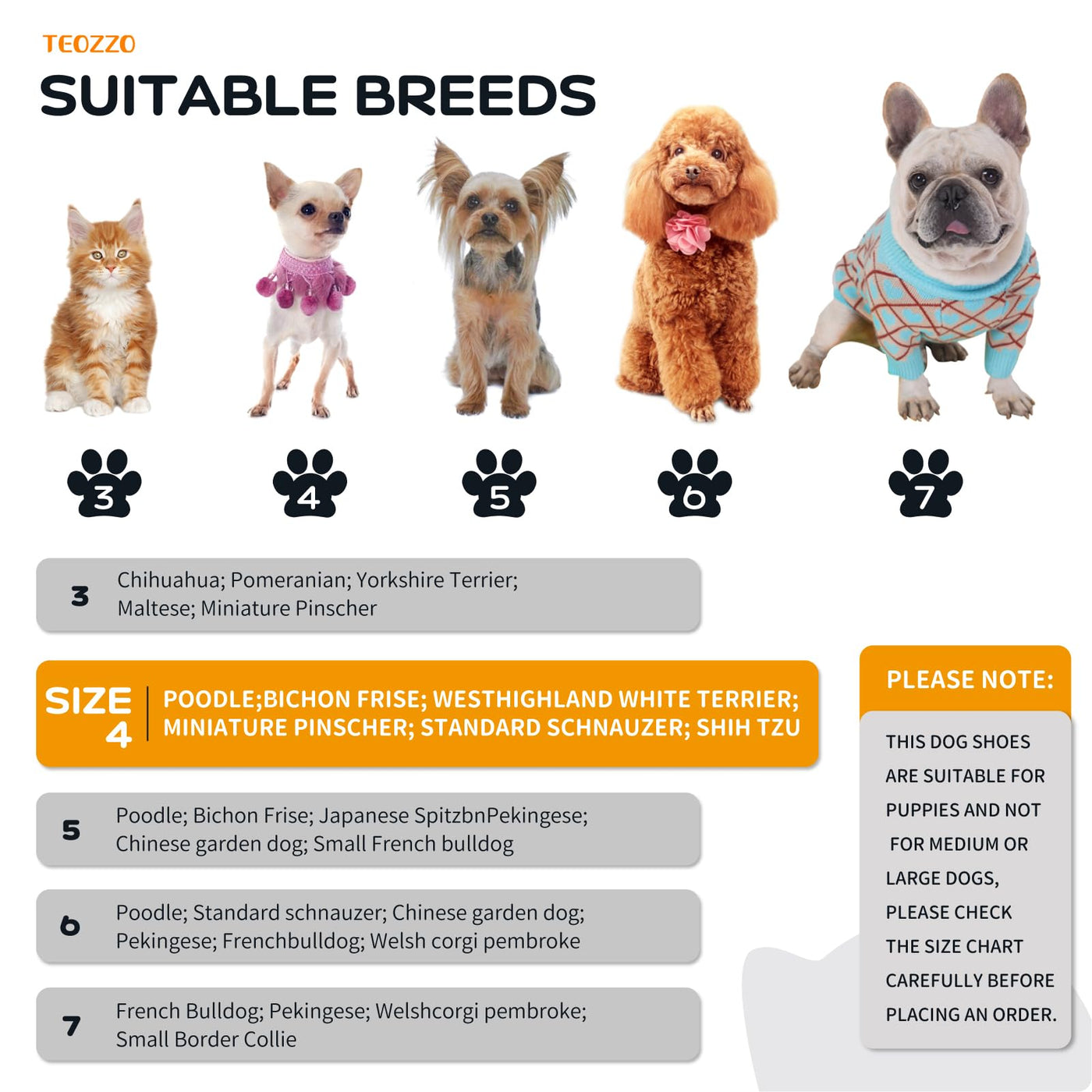 Q: What sizes are available for the TEOZZO Dog Boots?A: The TEOZZO Dog Boots are available in Size 4, with a width of 1.57 inches. It's important to measure your dog's paws accurately to ensure the best fit.