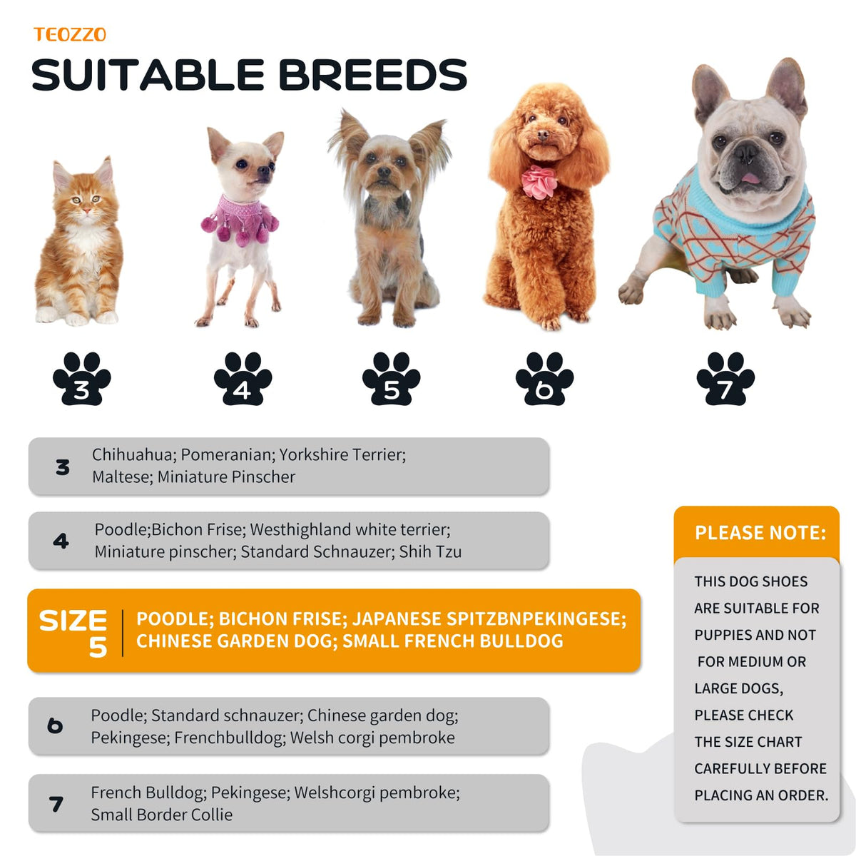 Q: What size dog boots do I need for my dog?A: To find the correct size for your dog, measure their paws by placing them on a piece of paper, marking the widest part including the toes and nails. Use the widest measurement and refer to the size chart to select the appropriate size. For the TEOZZO Dog Boots, Size 5 has a width of 1.77 inches.