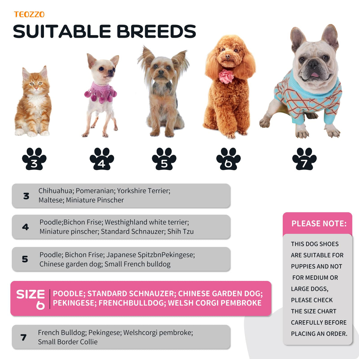 Q: What materials are used in the construction of these dog boots?A: The TEOZZO Dog Boots feature a durable non-slip rubber-particle sole for traction and stability, along with a soft fleece lining for comfort and warmth. They are designed specifically for small to medium-sized dogs.