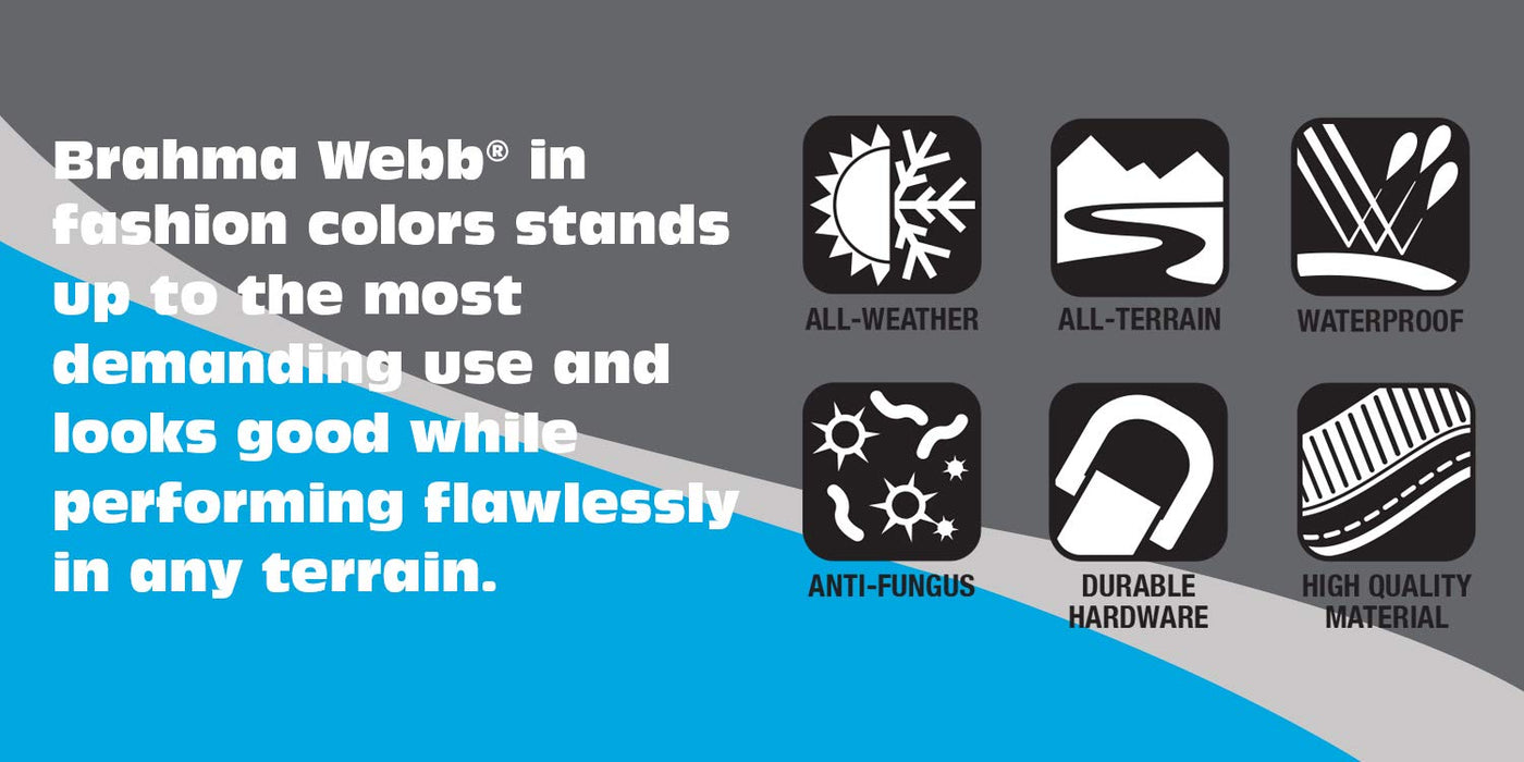 Rugged Brahma Webb stands up to the most demanding use and looks good while doing it. Weather-resistant low-maintenance and easy-to-clean Brahma Webb performs flawlessly in any terrain. Durable anodized aluminum dee with coordinating buckle.
