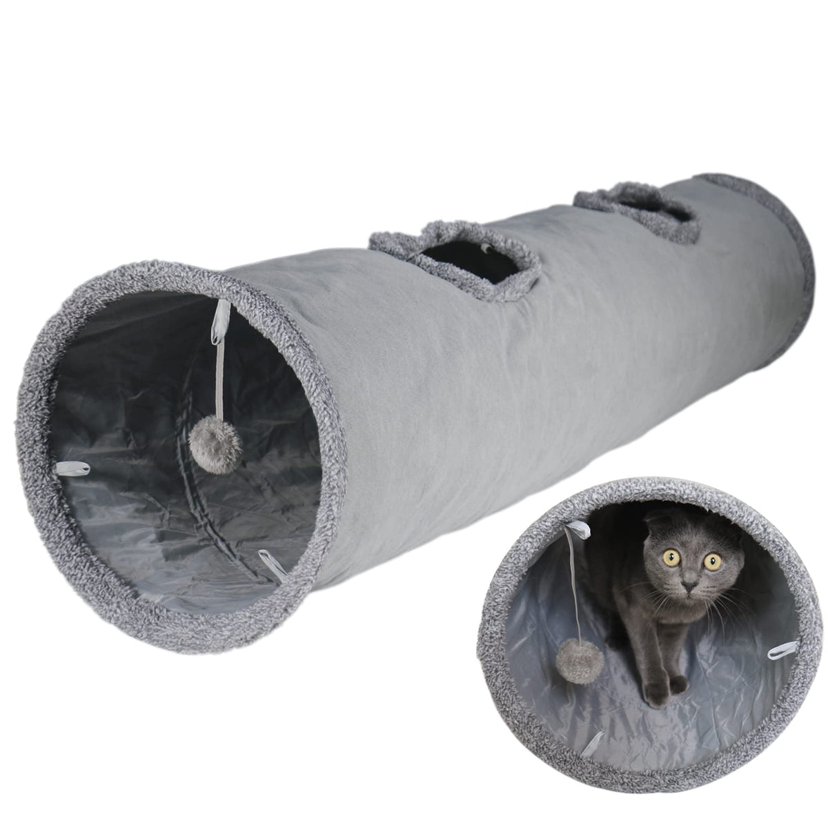Q: What material is the cat tunnel made of?A: The tunnel is constructed from durable suede with a polyester lining, ensuring it withstands vigorous play without tearing or scratching.