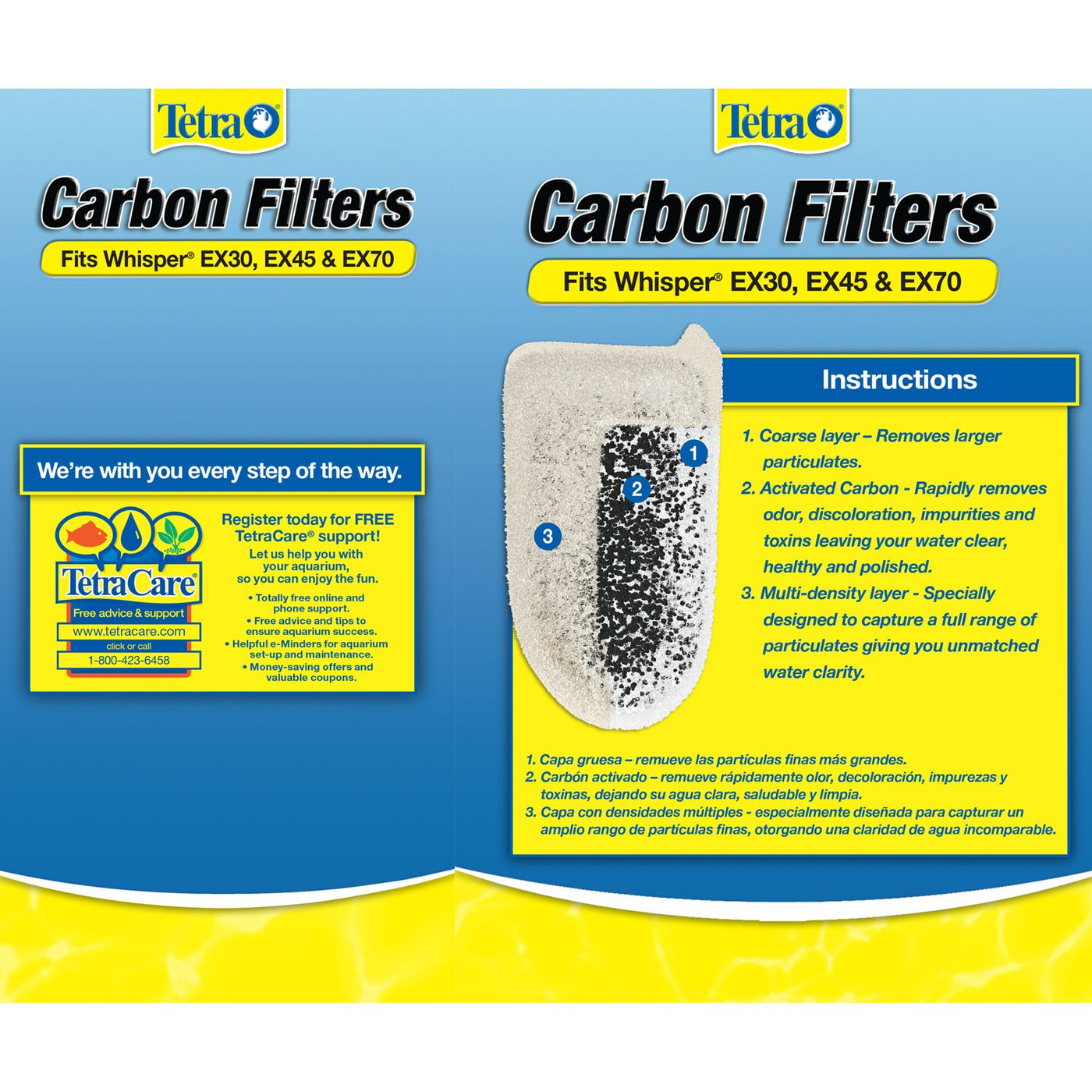 Q: What are Tetra Carbon Filters designed for?A: Tetra Carbon Filters are specifically designed for use with Tetra Whisper EX power filters, providing effective filtration by keeping aquarium water crystal clear and healthy. They utilize activated carbon to remove odors and discoloration, ensuring a polished water appearance.