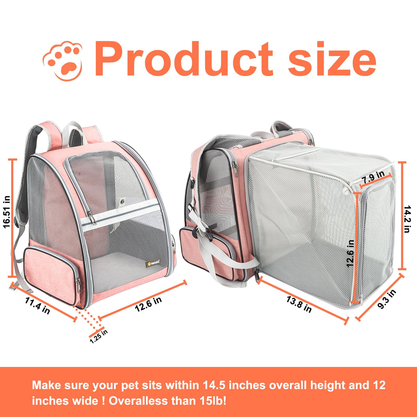 A Comfortable Ride For Small Cats & Dogs The Keyword Is Small. We Have Provided Precise Measurements To Consider When Determining If This Pet Carrier Backpack Is The Best Choice For Your Pet. A Small Dog Or Cat Over 10 Lbs. May Be Too Long To Be Comfortable For A Long Period Of Time In This Particular Dog Bag/ Cat Carrier Backpack. Your Pets Comfort Is Important, Especially On A Long Flight, Walk, Hike, Car Trip, Or Adventure. Please Measure Carefully. Sometimes You May Worry That Nobody Will Take Care Of Your Lovely Pets While You Are Travelling, Or Sometimes You Worry That You Will Miss Them So Much. Now Our Pet Carrier Backpack Will Solve Your Problem Perfectly. Wide Shoulder Straps Make It More Comfortable While Travelling Which Will Save You More Energy Taking Pet Out For Travelling Will Give You More Fun And At The Same Time Eliminates Your Worry About Your Pet During Your Absence. Now, Ready For Taking Your Pet Out An Adventure With Our Pet Carrier Backpack? Specifications: Material: Pvc Mesh Size:12.6'' L X 11.4'' W X 16.5'' H Load Capacity: 15Lbs Package Included: 1 X Pet Bag